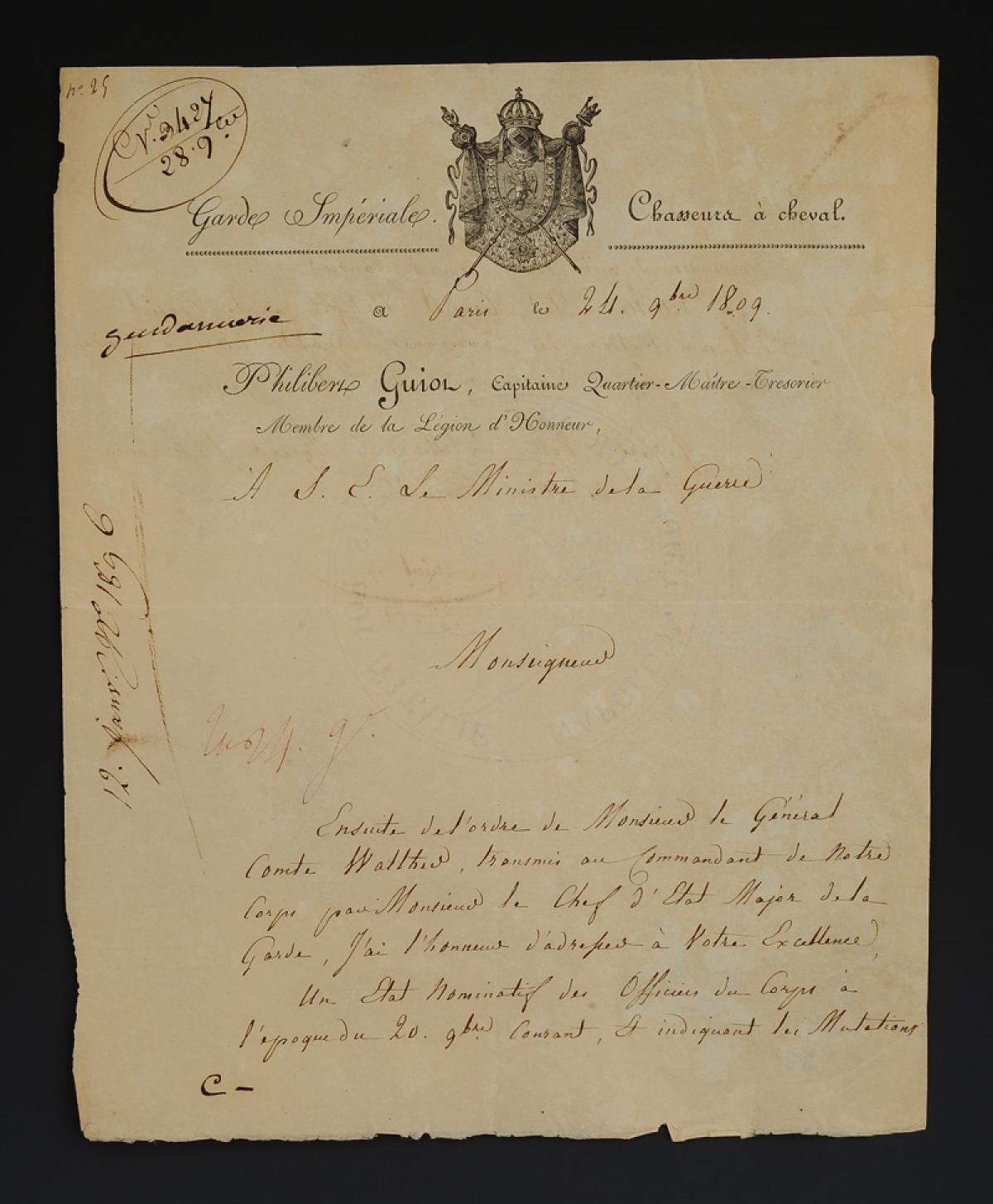 - Belle vignette. Entête « Garde Impériale / Chasseurs à cheval », à Paris le 24 9bre 1809.
