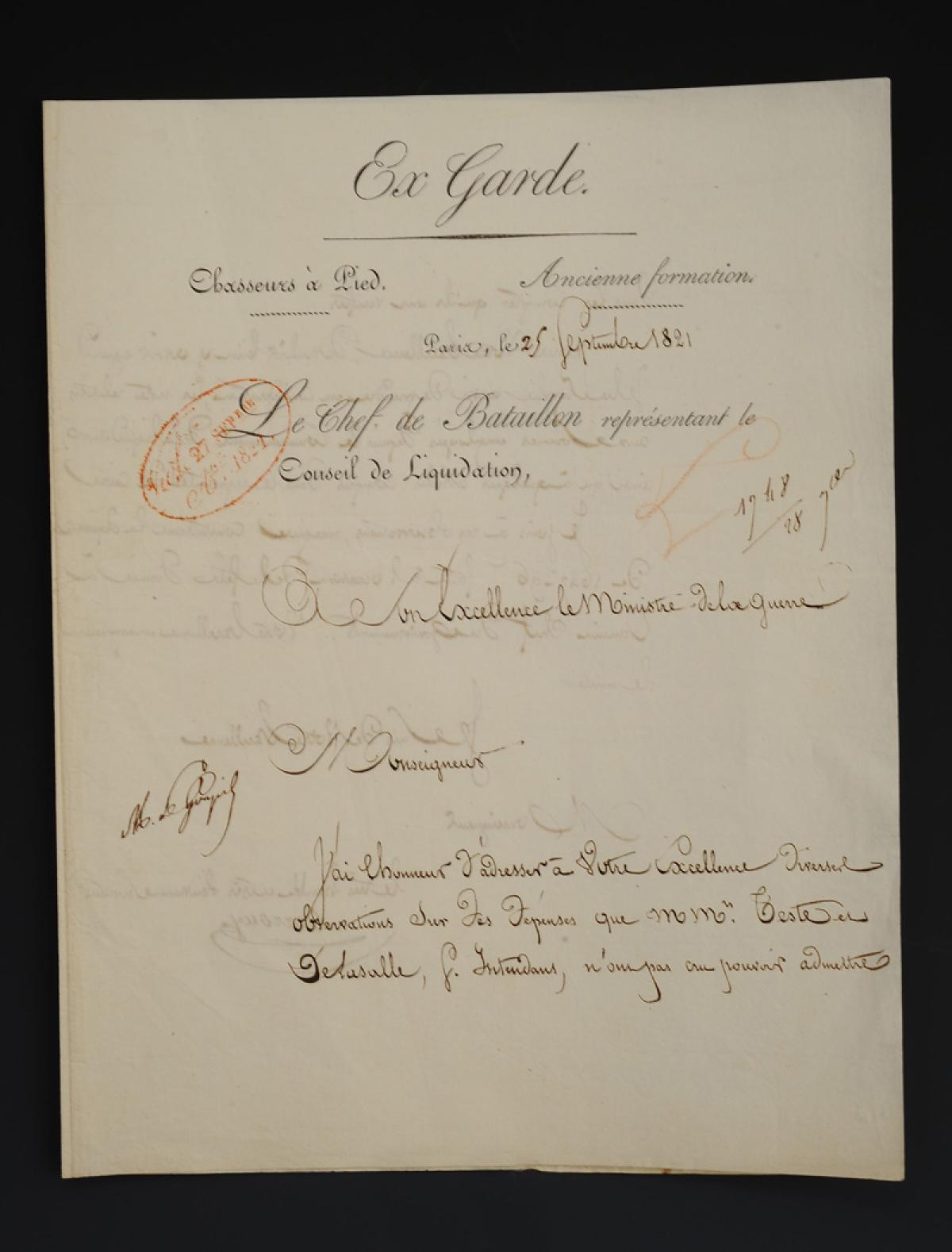 Ex GARDE CHASSEURS À PIED Ancienne Formation. Lettre d'accompagnement d'un document d'observations faites par MM. Teste et Delasalle sur des dépenses notées dans les comptes lors de la liquidation, signée du Chef de Bataillon Larrouy représentant le Conseil de Liquidation, 25 septembre 1812. 18907-27