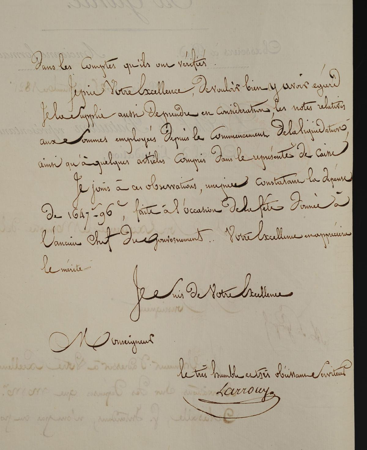 Je prie votre Excellence de vouloir bien y avoir égard. Je la supplie aussi de prendre en considération, les notes relatives aux sommes employées depuis le commencement de la liquidation ainsi qu'à quelques articles compris dans le représenté de caisse.