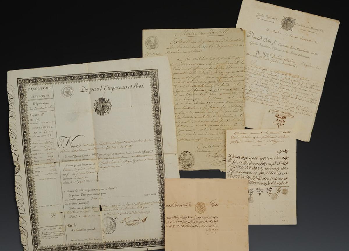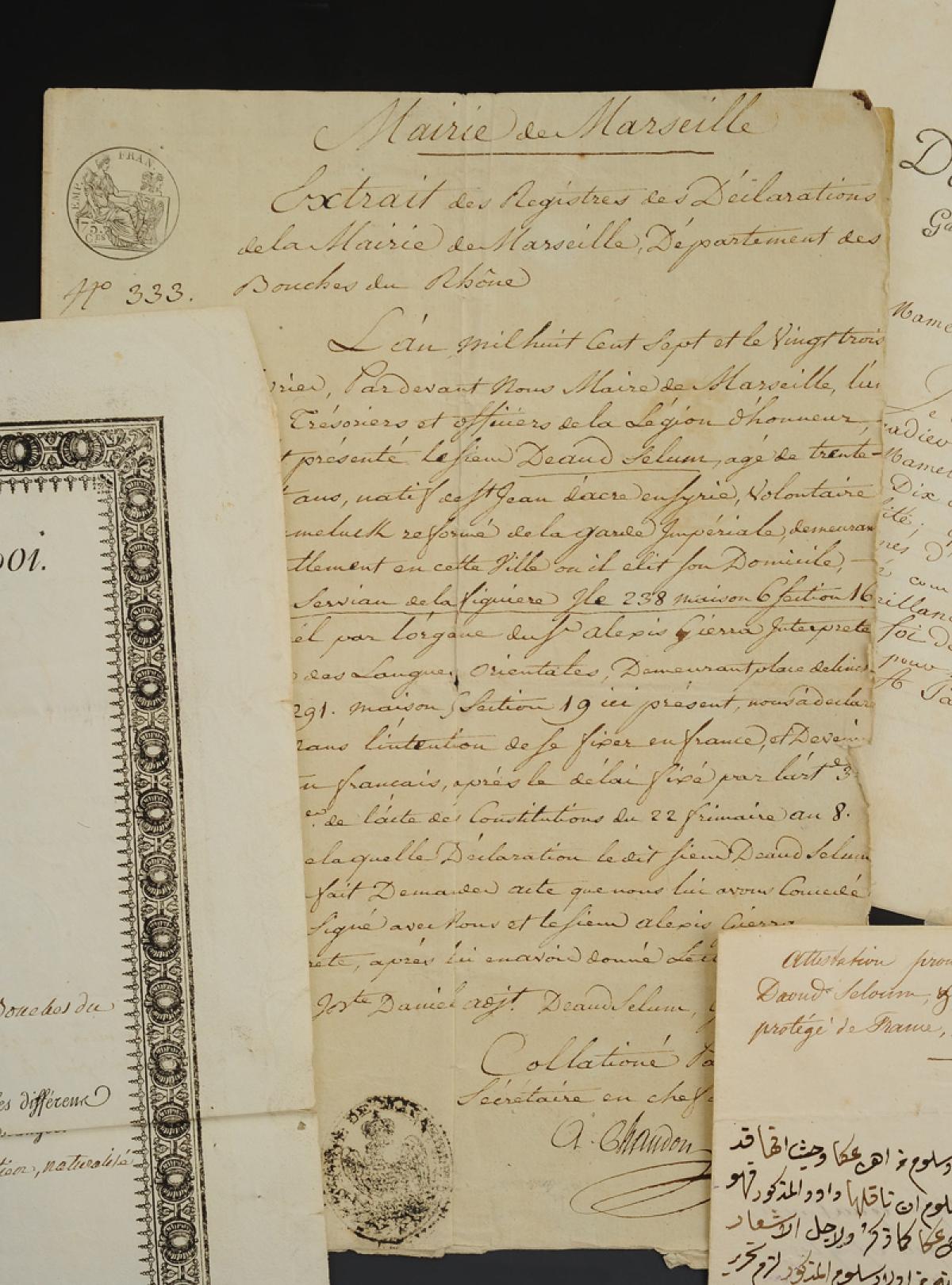 ENSEMBLE DE CINQ DOCUMENTS (1807 - 1811) CONCERNANT UN RÉFUGIÉ EGYPTIEN, DAOUD SALUM (SALOUMÉ), NATURALISÉ FRANÇAIS, demeurant à Marseille. 18907-29