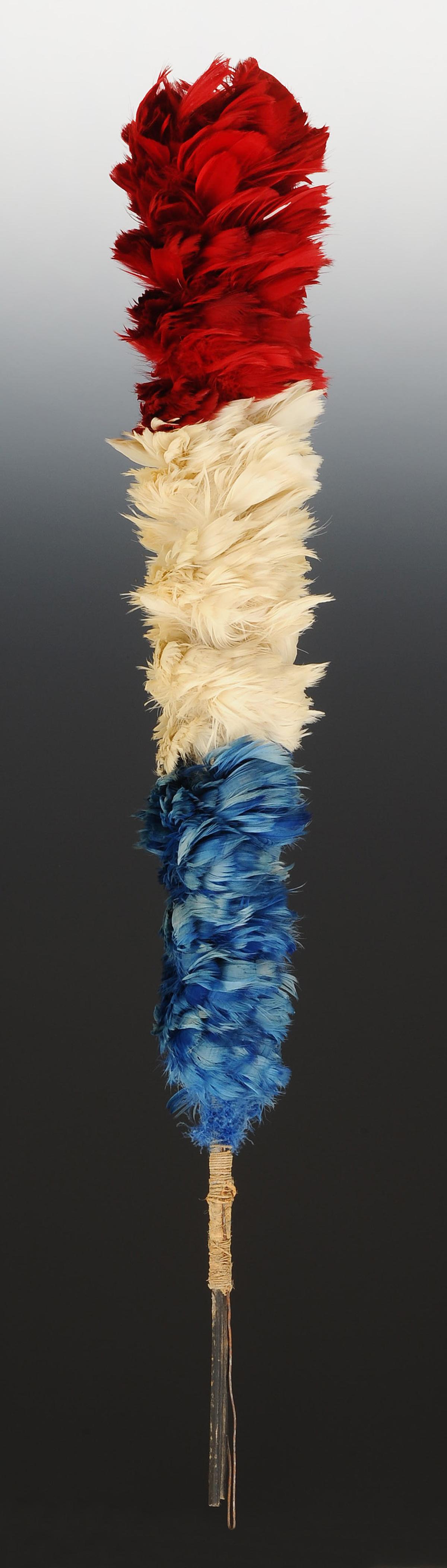 Plumet en plumes de coq tricolores montées sur baleine renforcée d'une tige métallique.