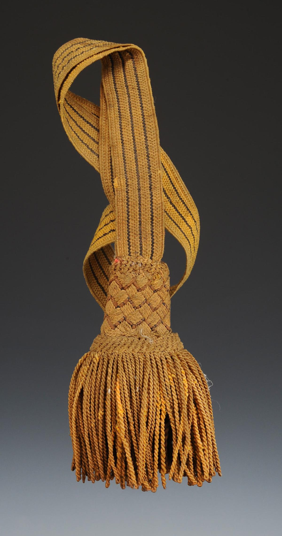 En passementerie dorée, le cordon est à galon d'or de 2,5 cm de large avec trois filets de soie noire et doublé de veau ciré jaune. Franges souples. Longueur totale avec les franges 47 cm.