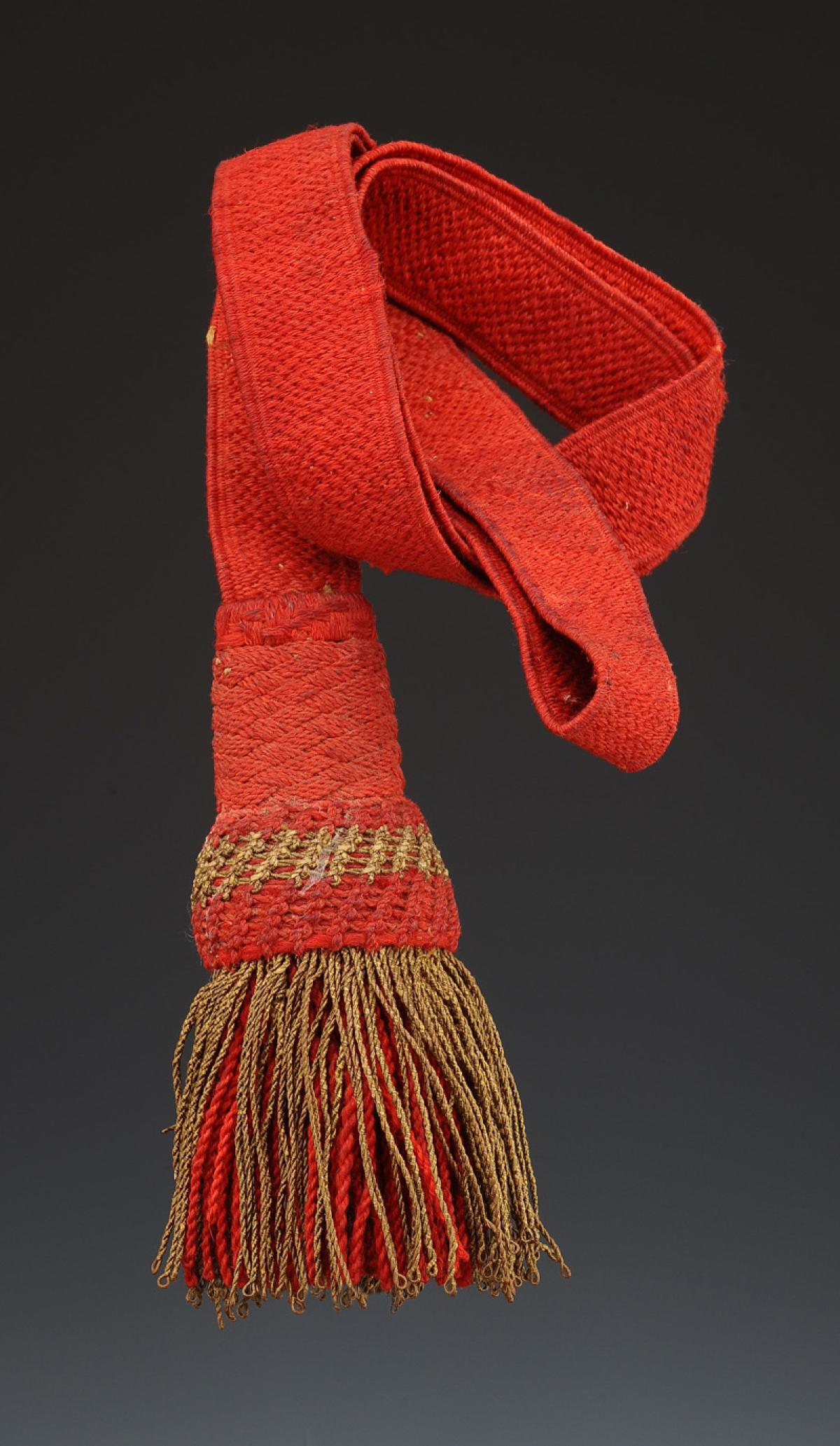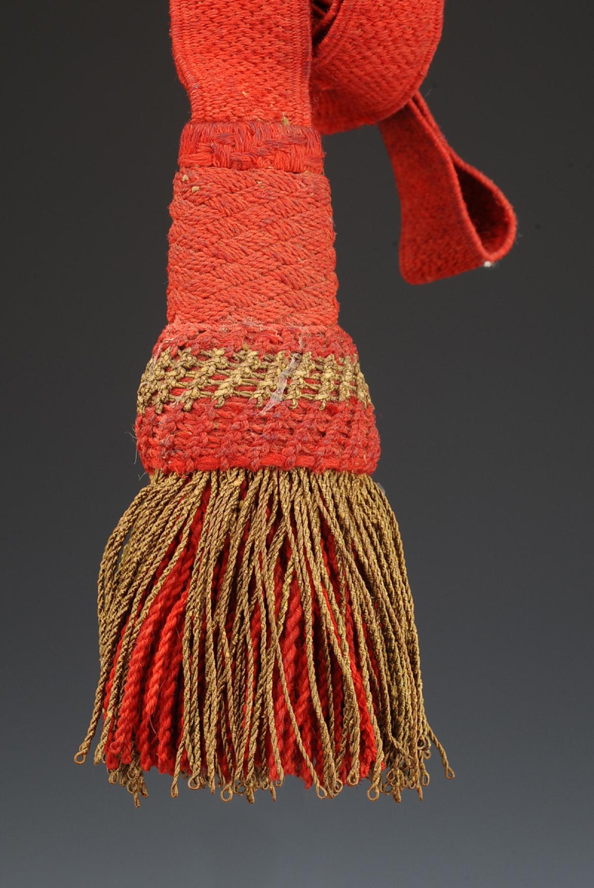 Cordon en laine écarlate de 2,3 cm de large. Gland et franges (souples) en passementerie de laine écarlate mélangée or. Longueur totale avec les franges environ 52 cm.