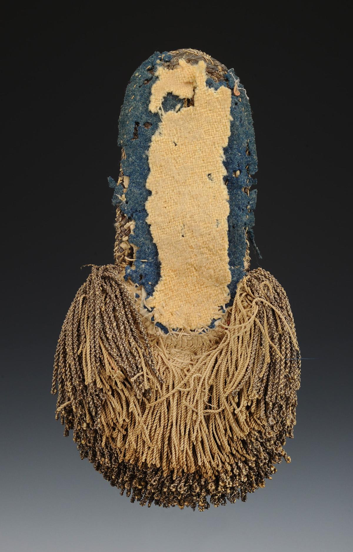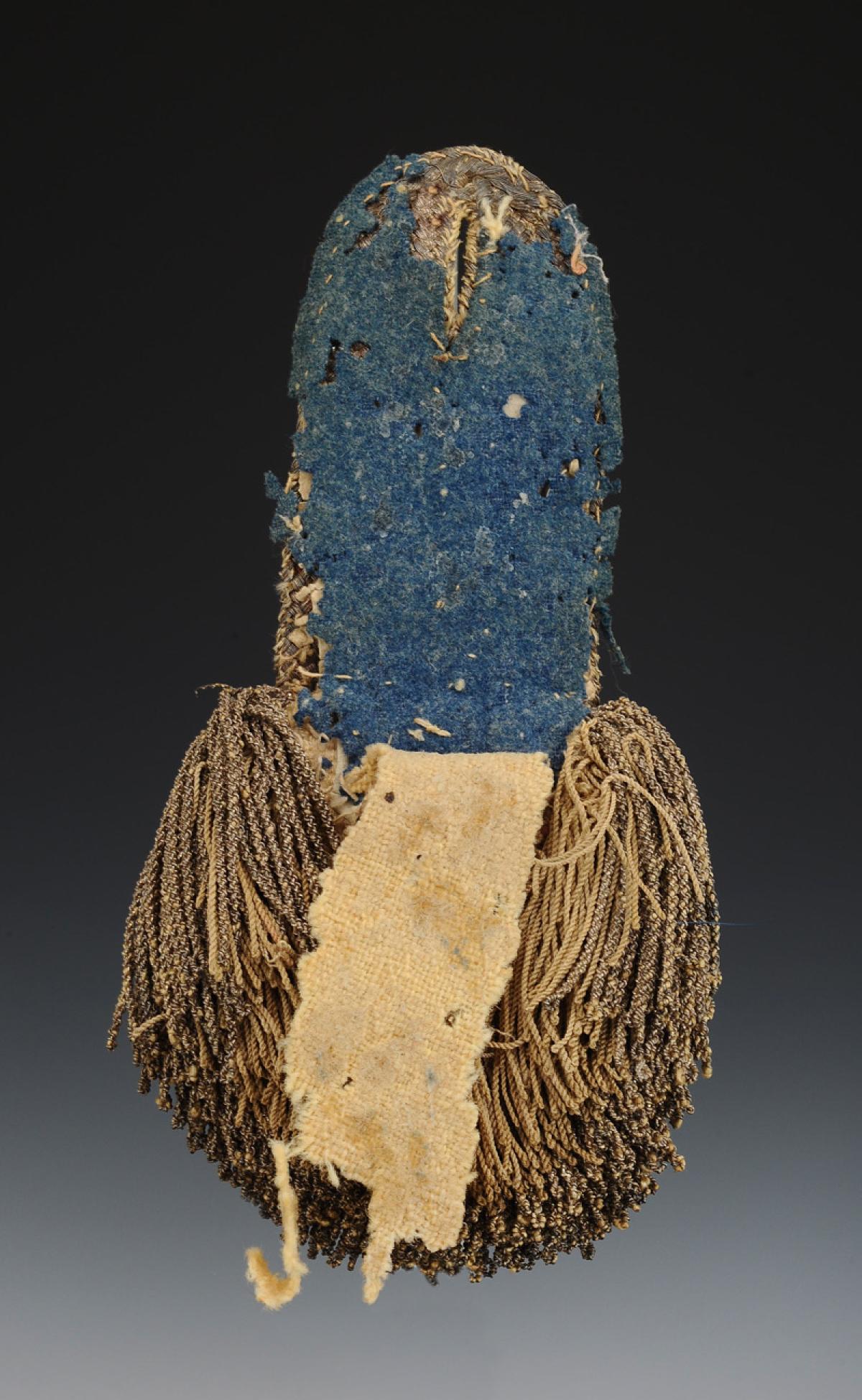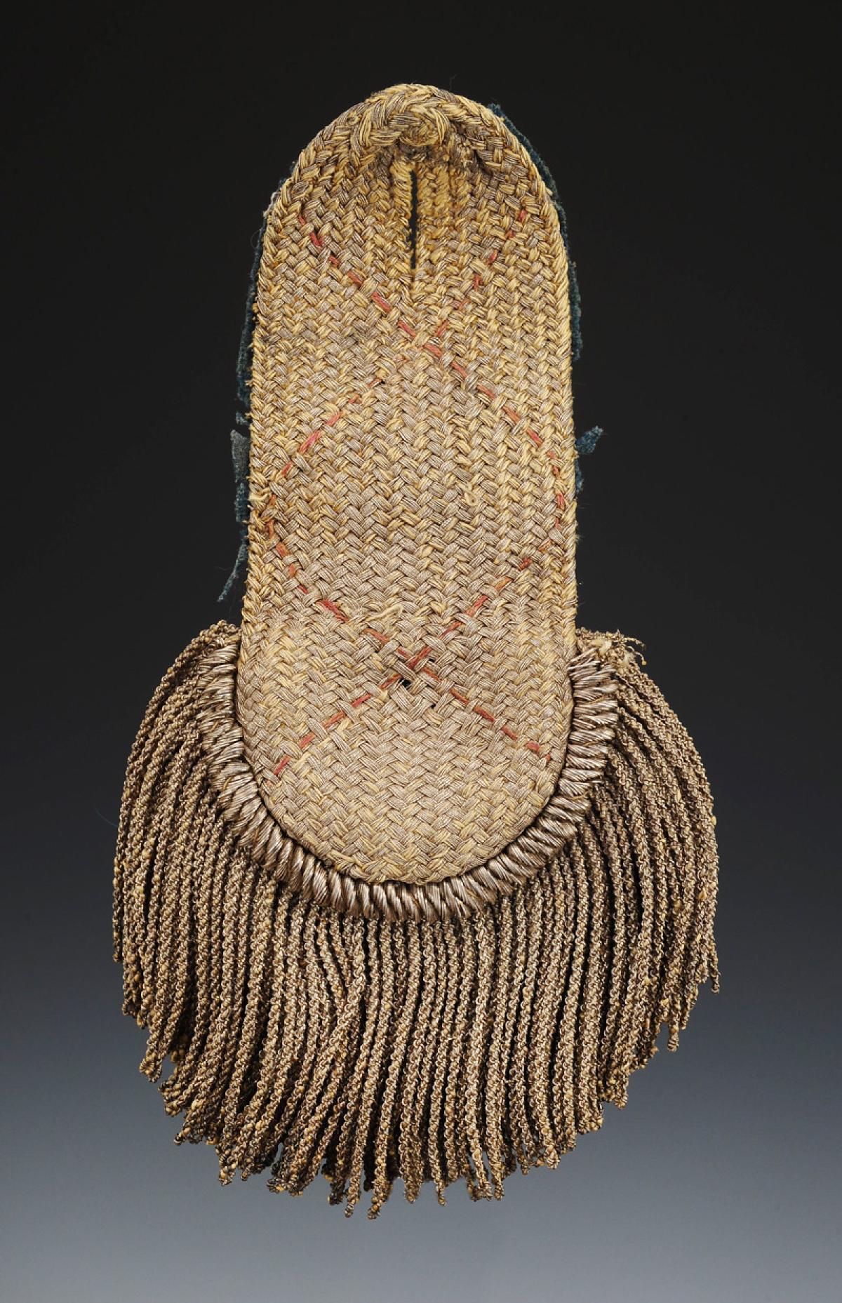 Épaulette entièrement en fils d’argent avec raies de soie écarlate formant losanges, corps tressé en passementerie, franges souples du modèle dit « cordes à puits », doublée de franges en laine blanche, doublure en drap bleu de ciel.