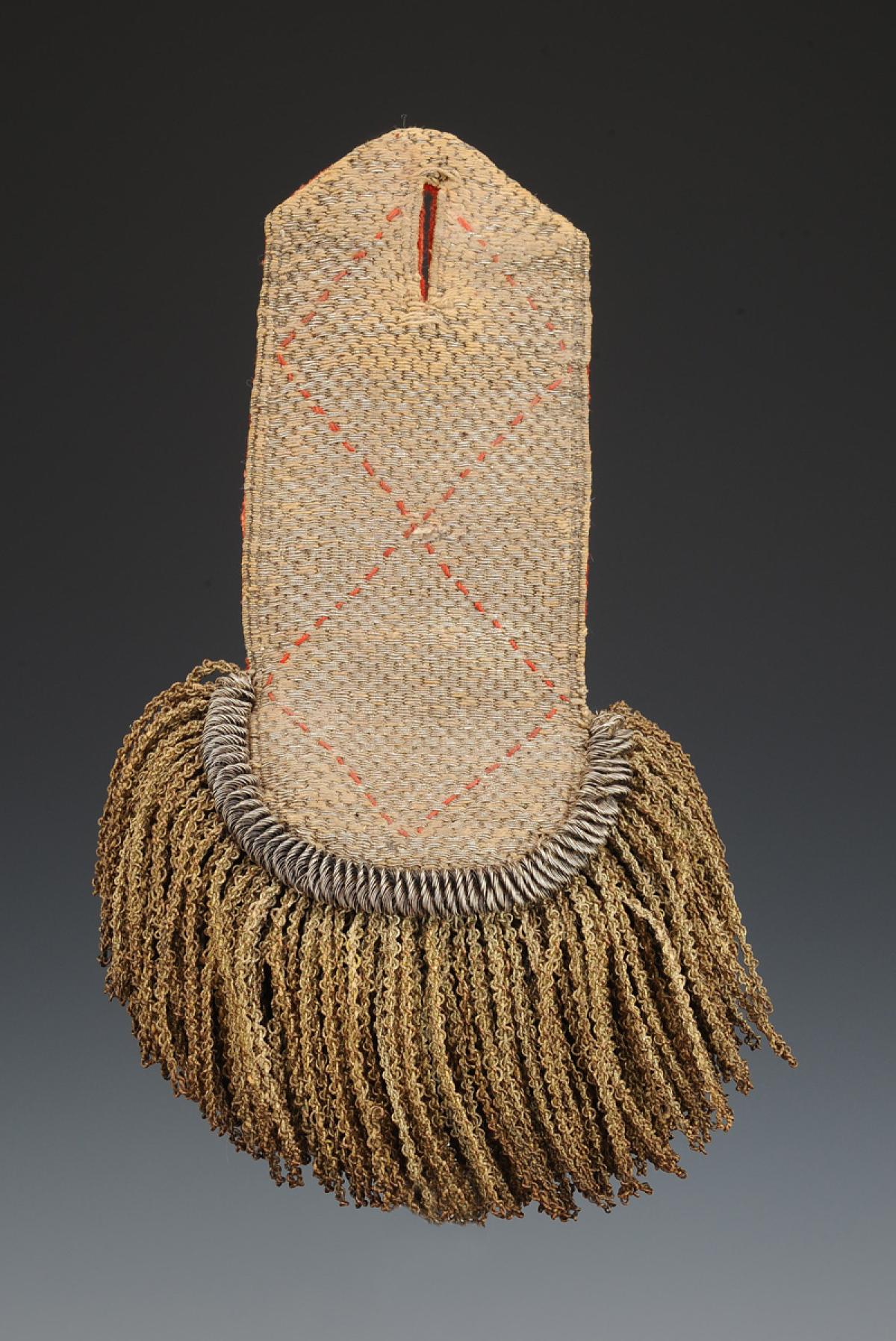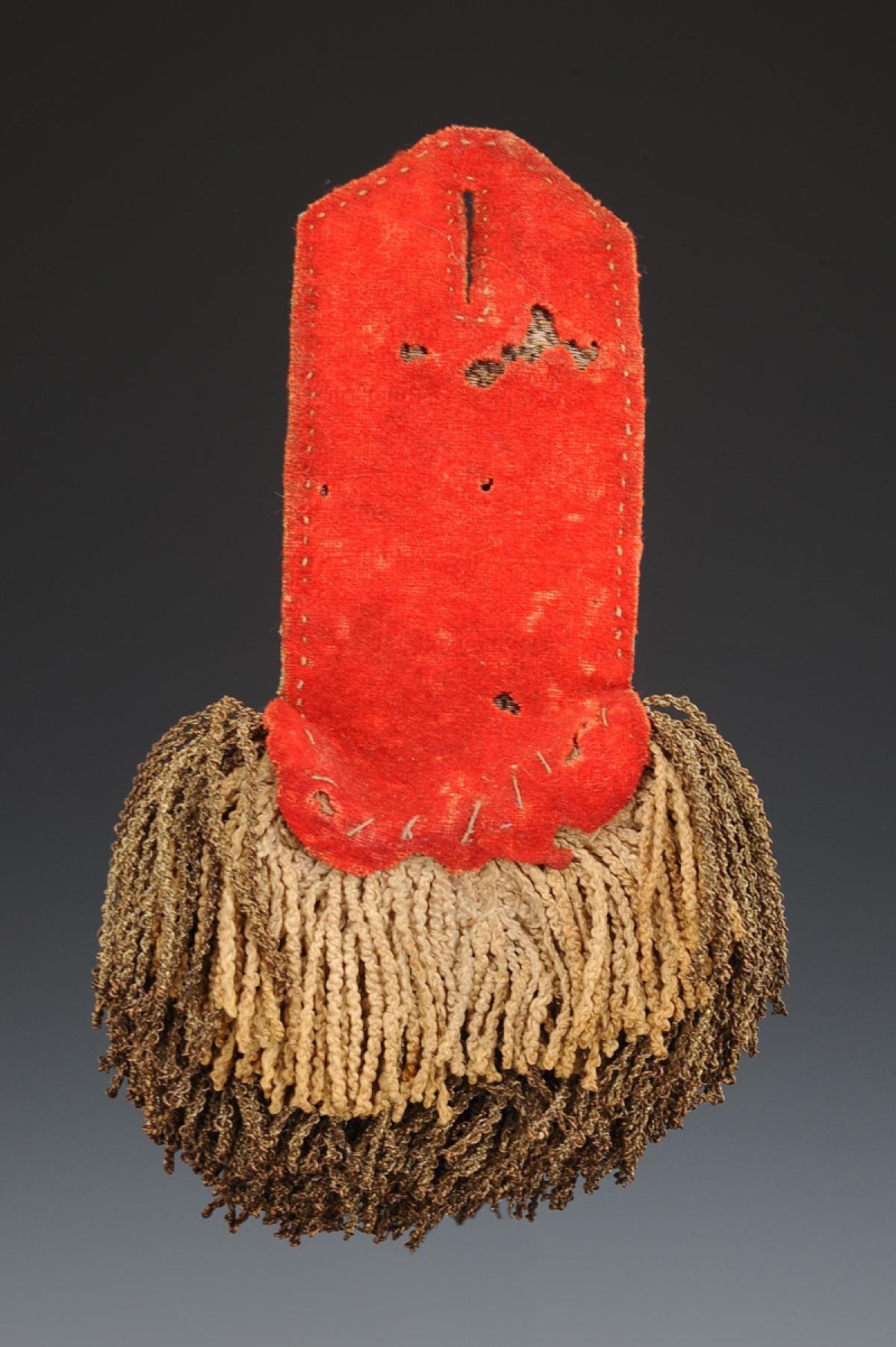 Épaulette entièrement en fils d’argent avec raies de soie écarlate formant losanges, corps tressé en passementerie, franges souples du modèle dit « cordes à puits », doublée de franges en laine blanche, doublure en drap écarlate.
