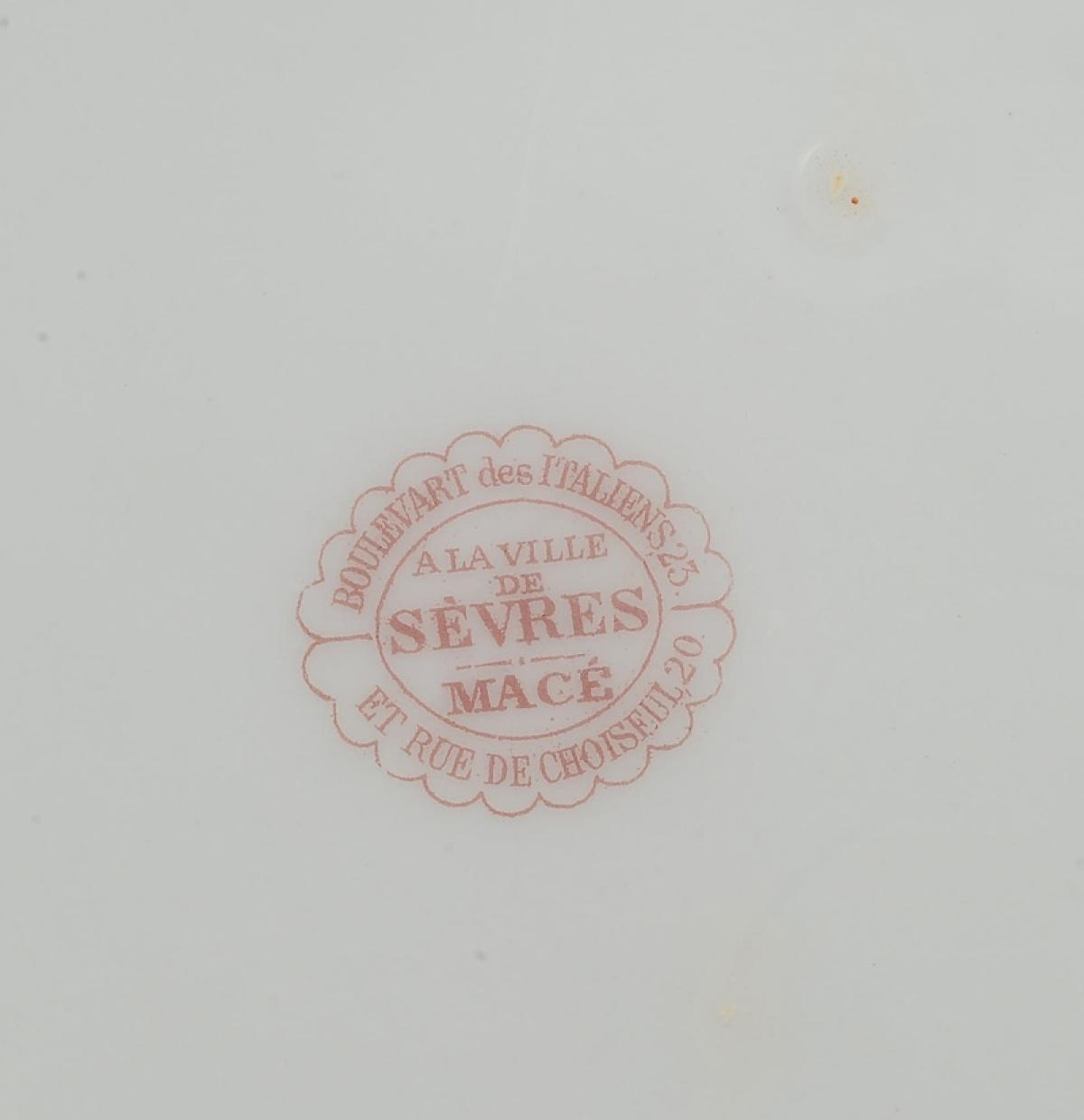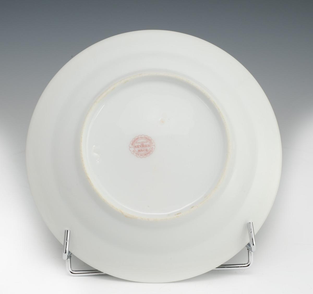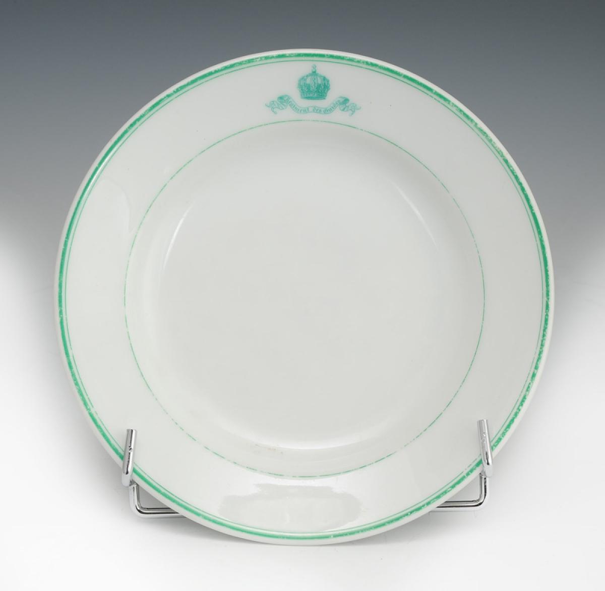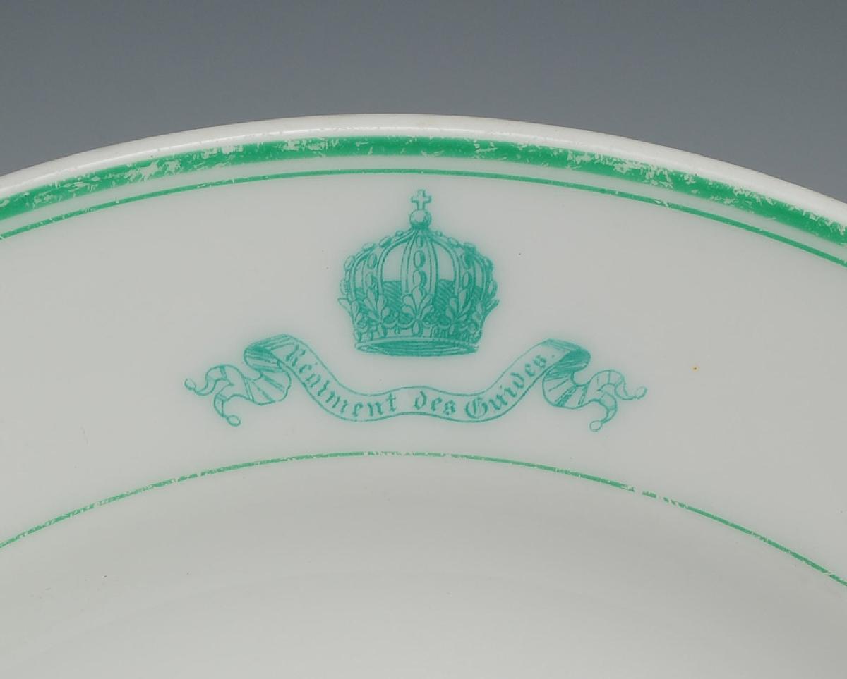 En faïence blanche avec, de couleur vert, une couronne impériale (modèle des Guides) surmontant un ruban portant l'inscription « Régiment des Guides ». Dessous du plat portant la marque de la manufacture de Sèvres.