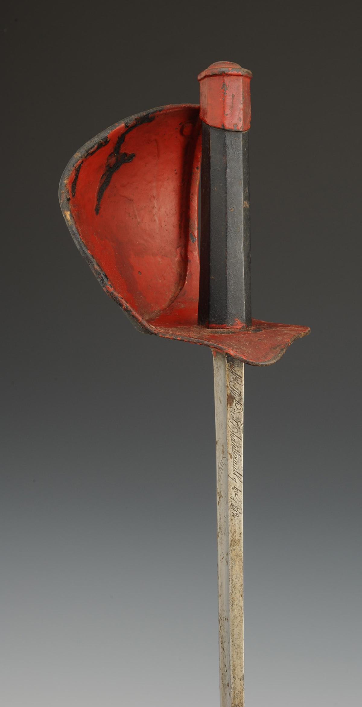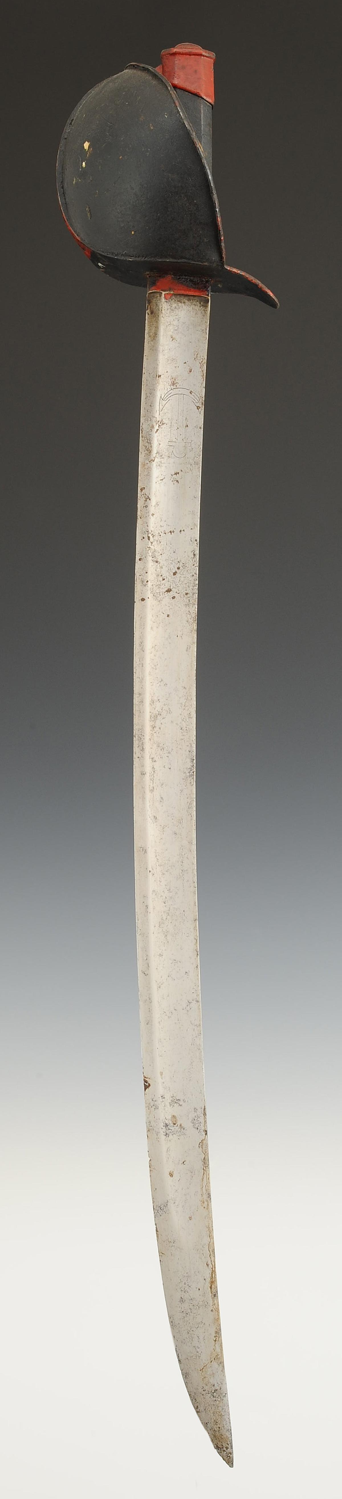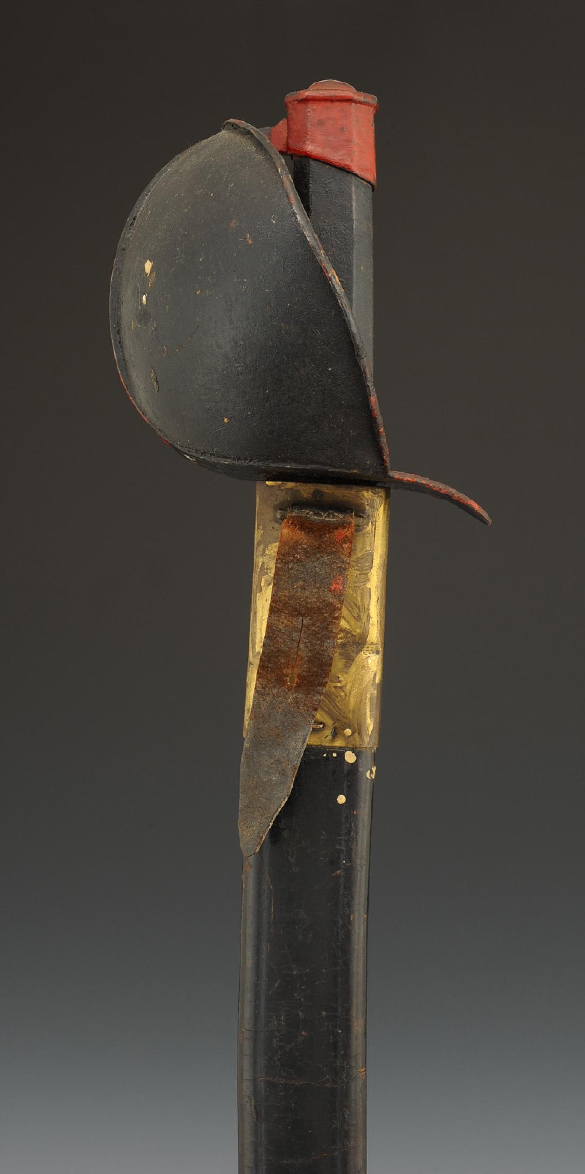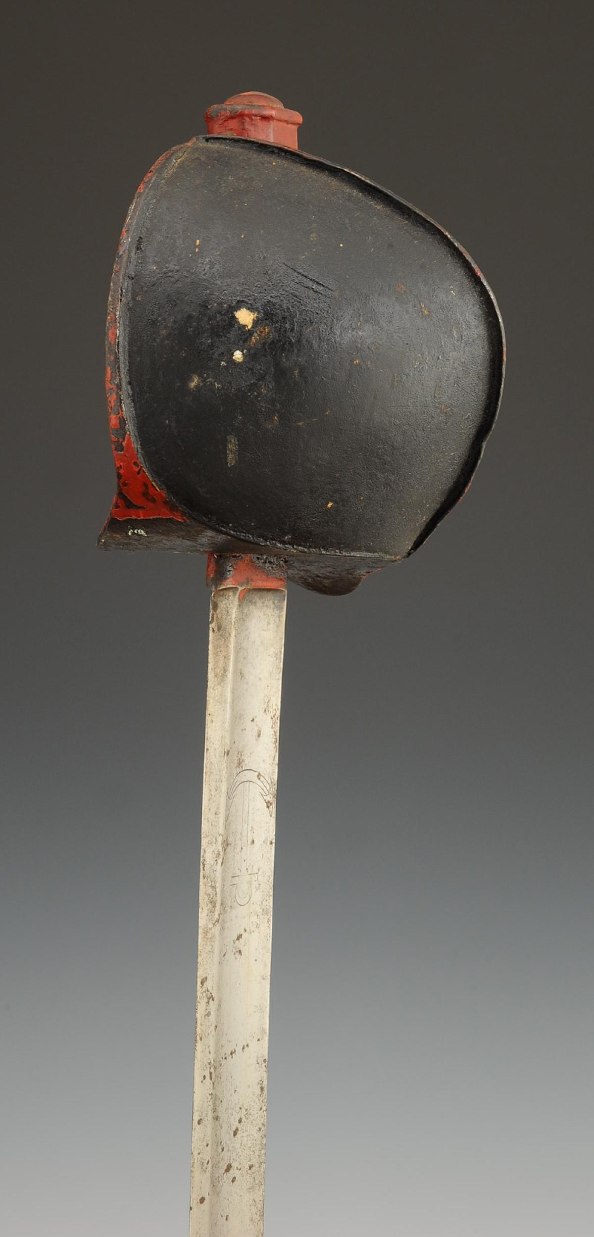 Garde entièrement en fer noirci à la poix, coquille pleine constituée d'une tôle d'acier, intérieur de la coquille peint écarlate. Calotte et poignée en bois de coupe octogonale gainées de tôle.