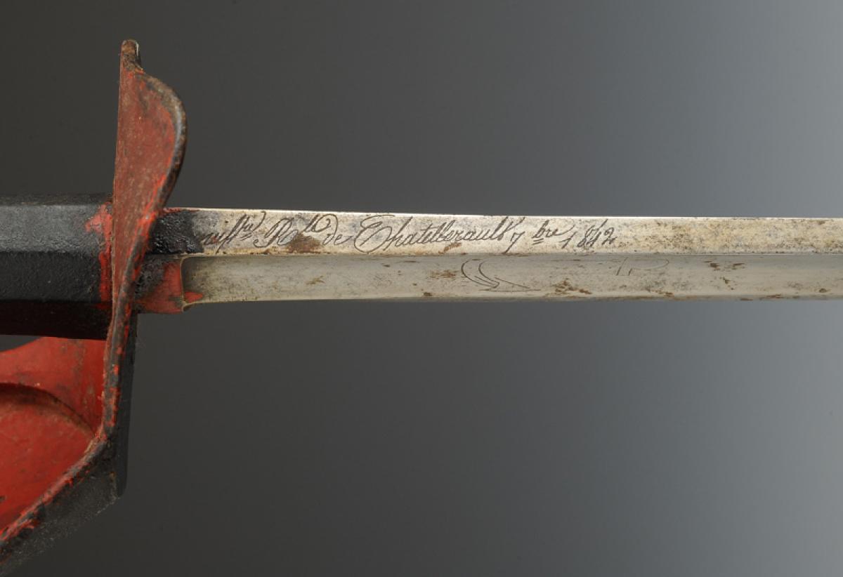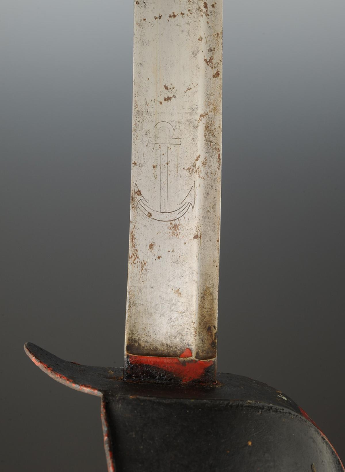 Lame à pans creux, longueur 67,2 cm, avec ancre gravée sur chaque face. Dos marqué « Manufre Rle de Châtellerault 7bre 1842 ». Fourreau en cuir à deux garnitures de laiton, chape à pontet avec tirant en cuir verni noir.