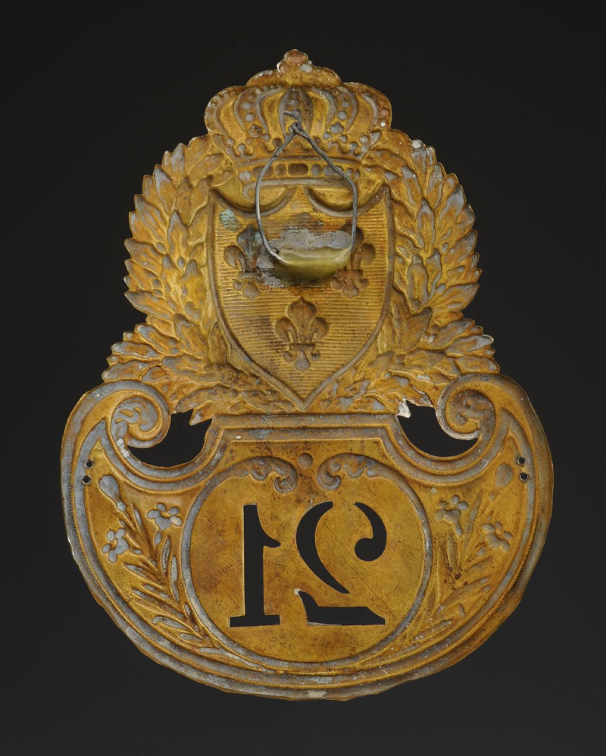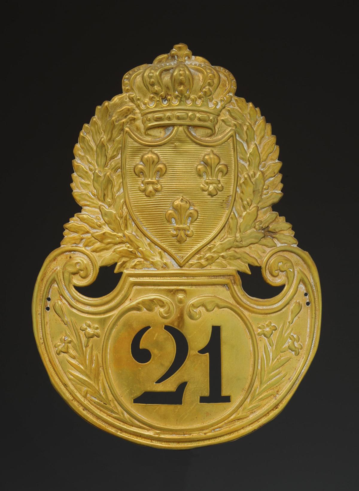 En laiton estampé en relief d’un écu timbré de trois fleurs de lys, surmonté de la couronne royale et encadré de branches de laurier. Cet écu est posé sur un soubassement bordé dans le bas de deux branches de lys dont le centre est découpé du chiffre « 21 » à fond lisse, avec une simple moulure terminée en partie haute par deux feuilles d'eau. H 13,8 cm, largeur 10,2 cm.