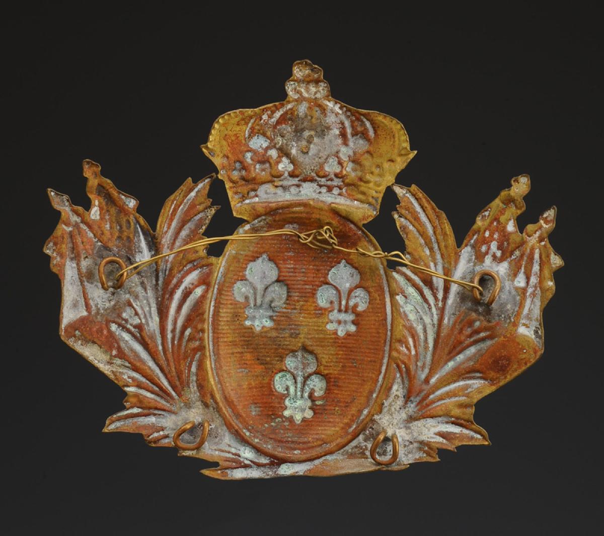 Plaque en laiton estampé des Armes de France encadrées de palmes et de drapeaux. H 7 cm, largeur 8,5 cm. Complète de ses quatre attaches arrière de fixation.