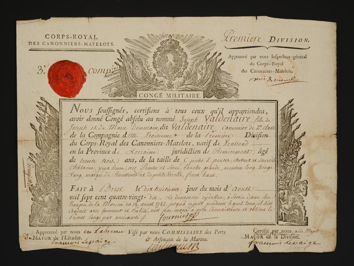Corps-Royal des Canonniers-Matelots. CONGÉ MILITAIRE ABSOLU DÉLIVRÉ À JOSEPH VALDENAIRE, canonnier de 2e classe de la 3ème Compagnie, 1ère Division du Corps-Royal des Canonniers-Matelots, le 18 août 1790. 18908-3