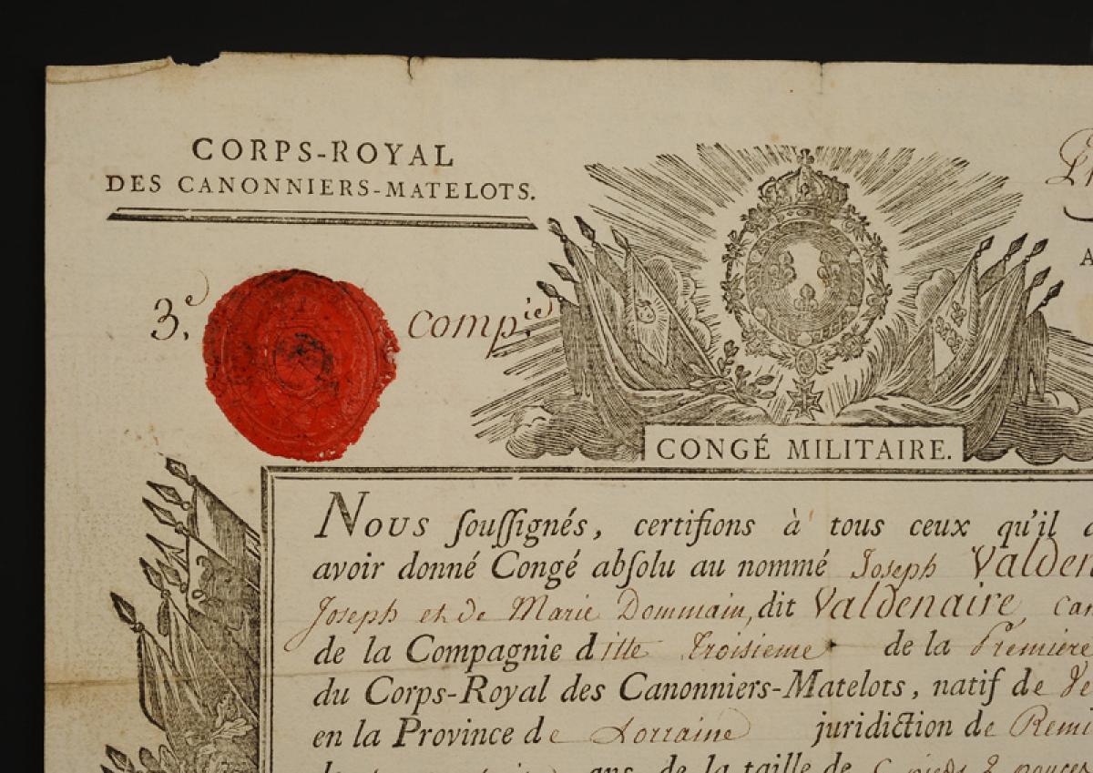 Congé militaire absolu donné à « Joseph VALDENAIRE, dit Valdenaire, canonnier de 2e classe de la Compagnie ditte Troisième de la Première Division du Corps-Royal des Canonniers-Matelots natif de Ventrond ».
