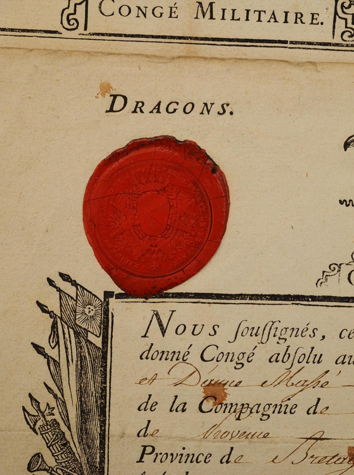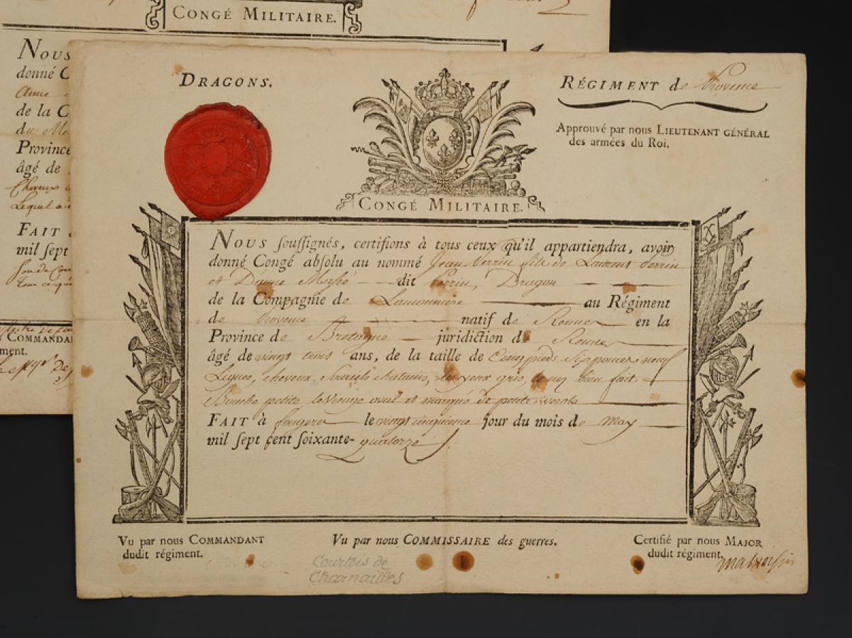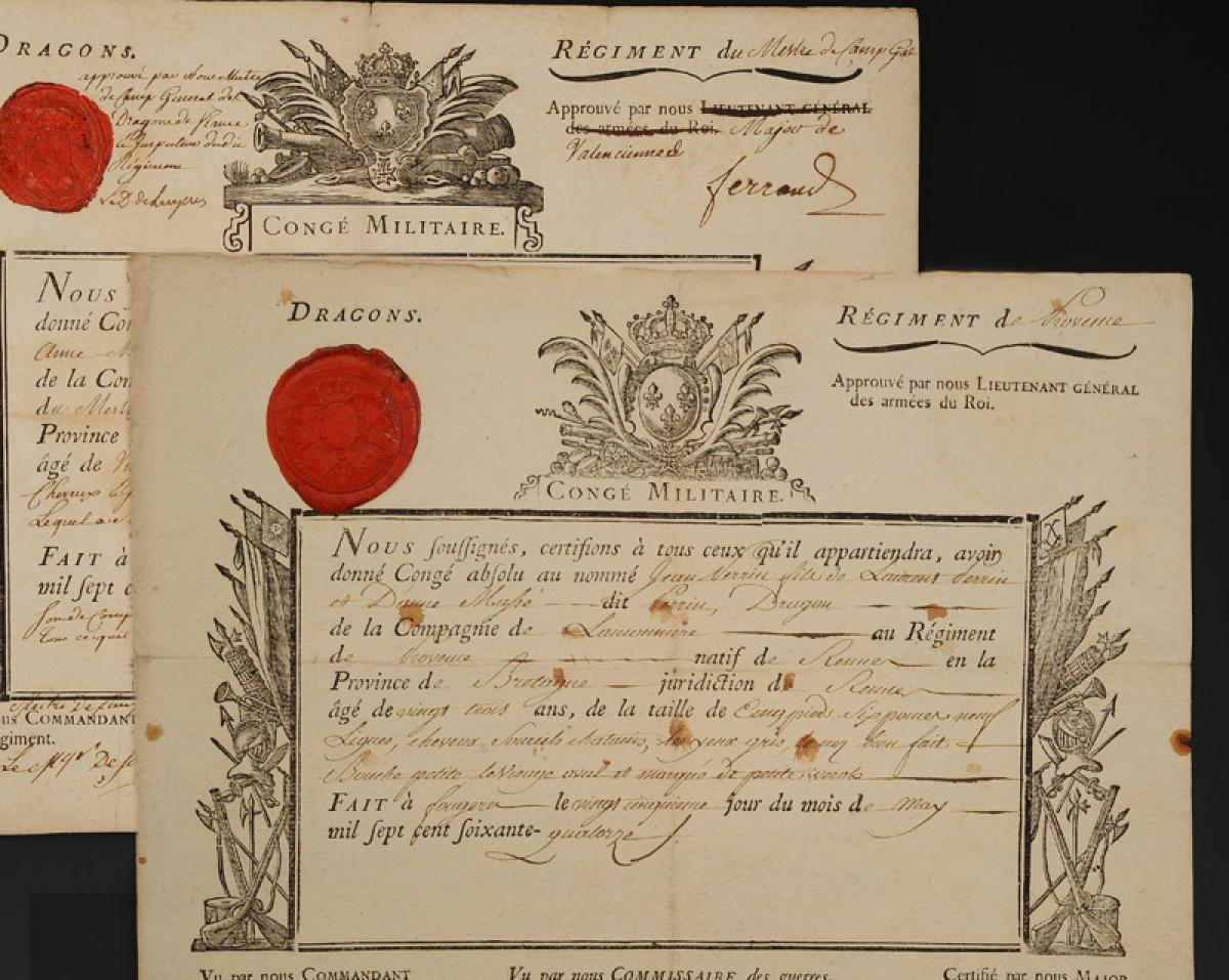 Dragons. DEUX CONGÉS MILITAIRES ABSOLUS DÉLIVRÉS À JEAN PERRIN, du Régiment de Provence en 1774 et du Régiment du Mestre de Camp Général en 1777. 18908-4