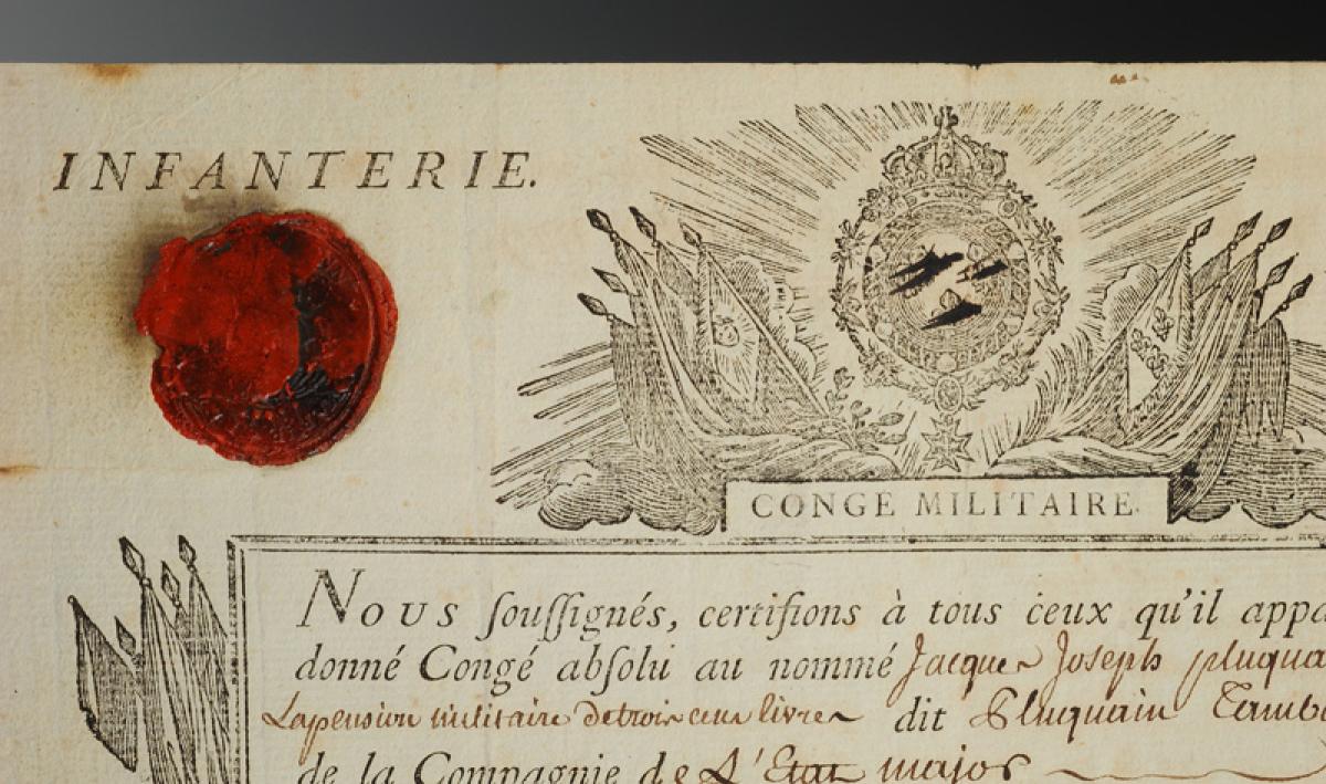 Infanterie. Régiment de la Couronne. CONGÉ MILITAIRE ABSOLU DÉLIVRÉ À JACQUES JOSEPH PLUQUAIN, tambour major de la Compagnie de l'Etat-major au Régiment de la Couronne, 19 mars 1784. 18908-7