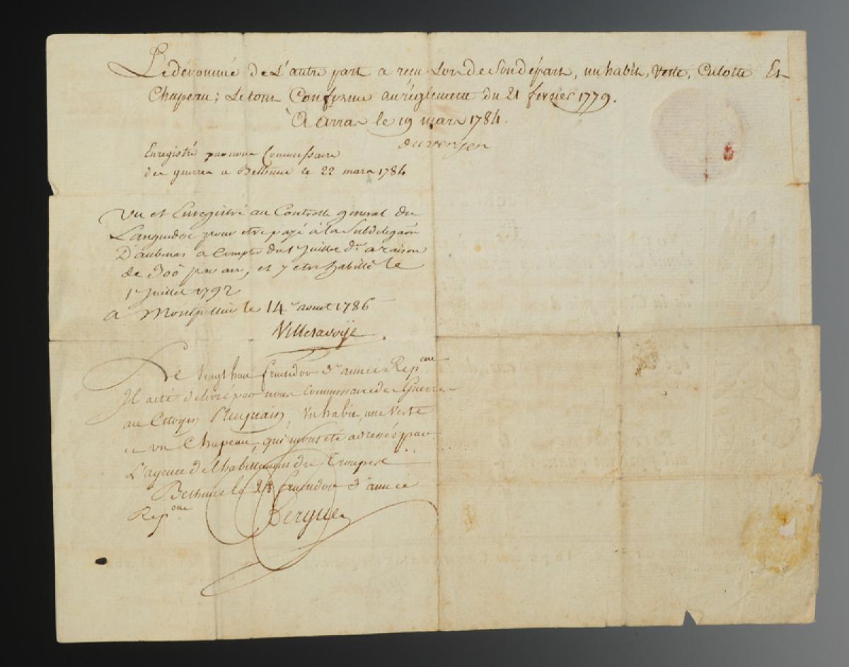 Au verso, quatre notes manuscrites donnant le détail et attestant des effets remis au dénommé lors de son départ,