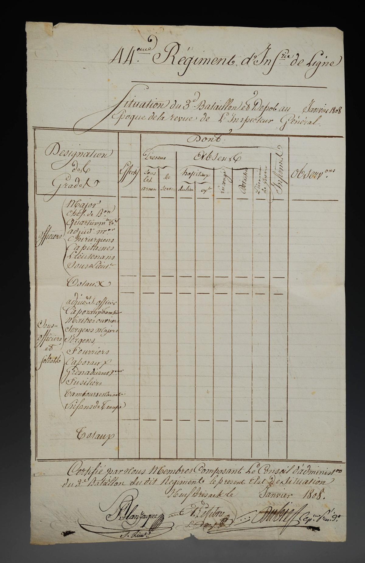 Au verso, Tableau dudit régiment : Situation du 3è Bataillon et Dépôt Janvier 1808. Non complété.
