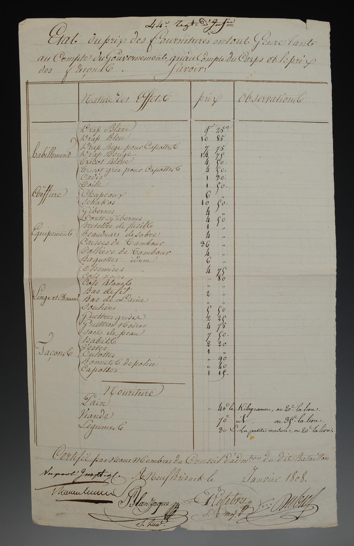 44ème Régiment d'Infanterie. ÉTAT DU PRIX DES FOURNITURES EN TOUT GENRE, janvier 1808. 18909-1