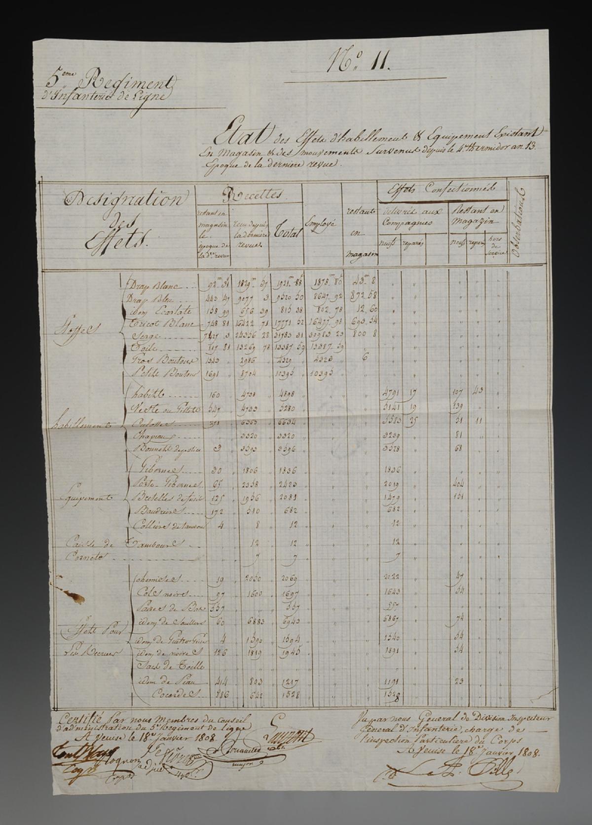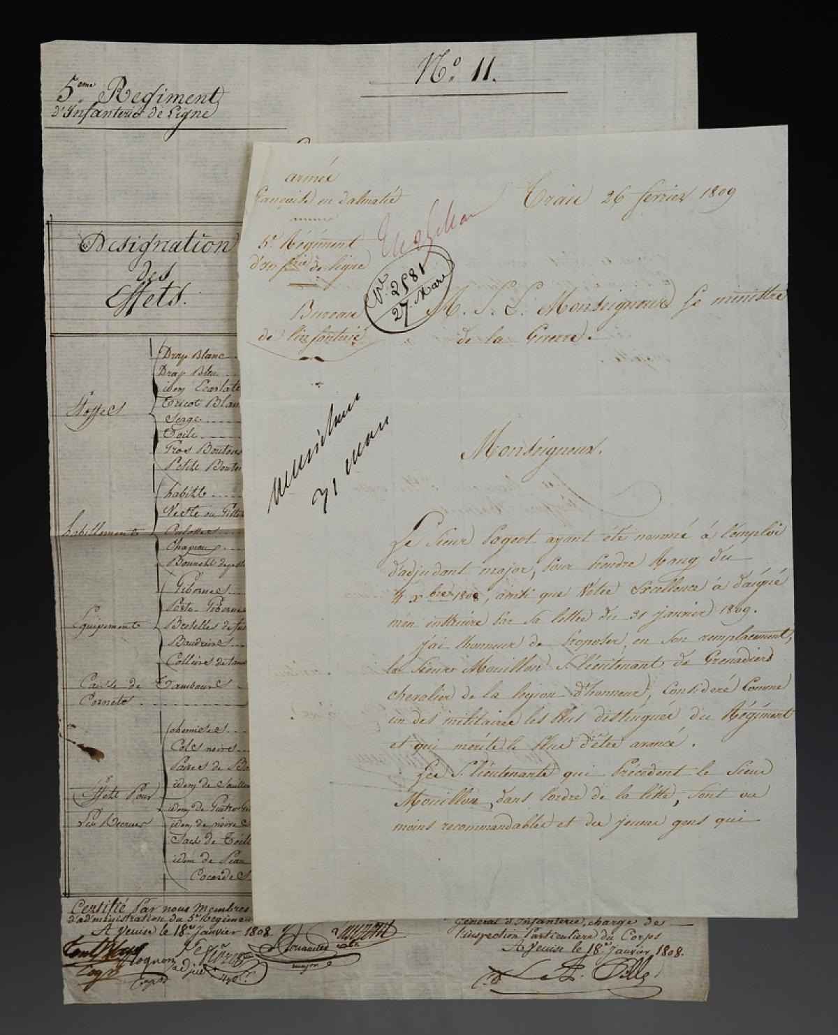 5ème Régiment d'Infanterie de Ligne. Lot de 2 documents : ÉTAT DES EFFETS D'HABILLEMENT ET ÉQUIPEMENT EXISTANT EN MAGASIN ET DES MOUVEMENTS SURVENUS, 18 janvier 1808, LETTRE SIGNÉE CHEVALIER DE PLAUZONNE pour un remplacement, 26 février 1809, . 18909-2