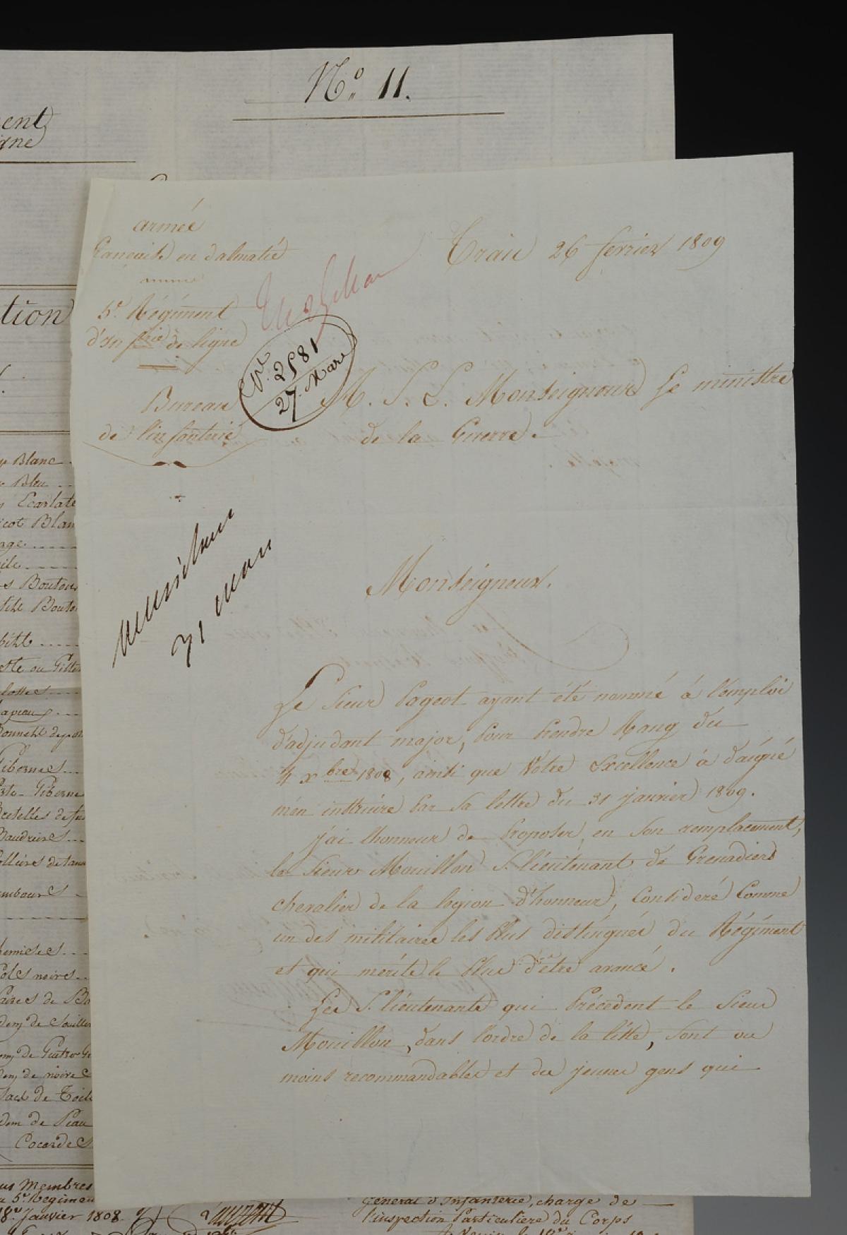 - À entête de l'Armée Française de Dalmatie. Signée par le Colonel dudit régiment « Chevalier de Plauzonne » adressée au Ministre de la Guerre. Proposition de remplacement du sieur Pageot nommé adjudant major, par le sieur Mouillon, sous-lieutenant de grenadiers, chevalier de la Légion d'Honneur.