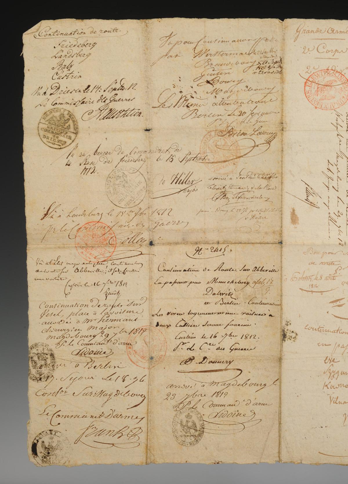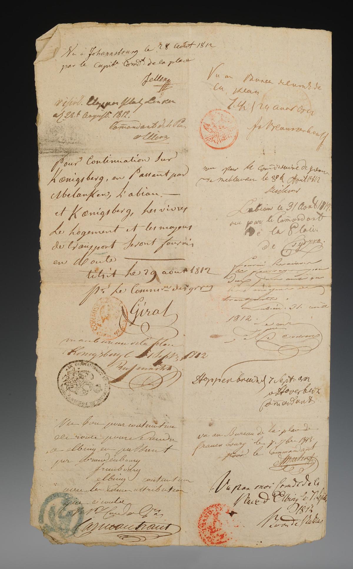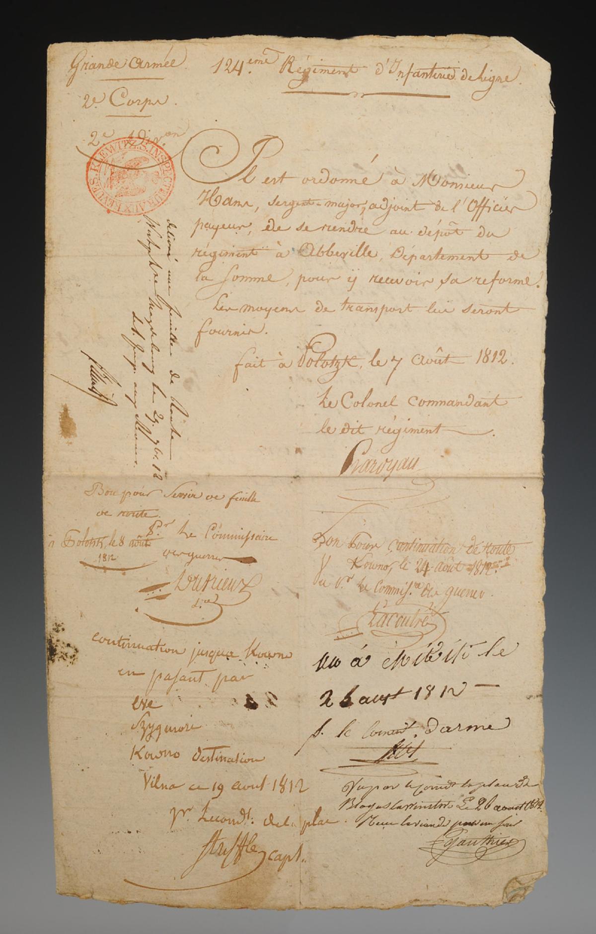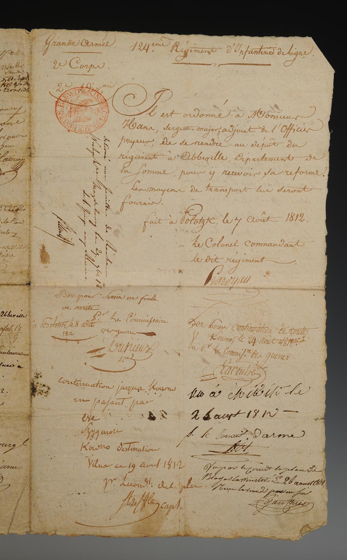 « Il est ordonné à Monsieur Hams (?), sergent-major, adjoint de l'Officier payeur de se rendre au dépôt du régiment à Abbeville, Département de la Somme, pour y recevoir sa réforme. Les moyens de transport lui seront fournis. Fait à Polotzk, le 7 août 1812.