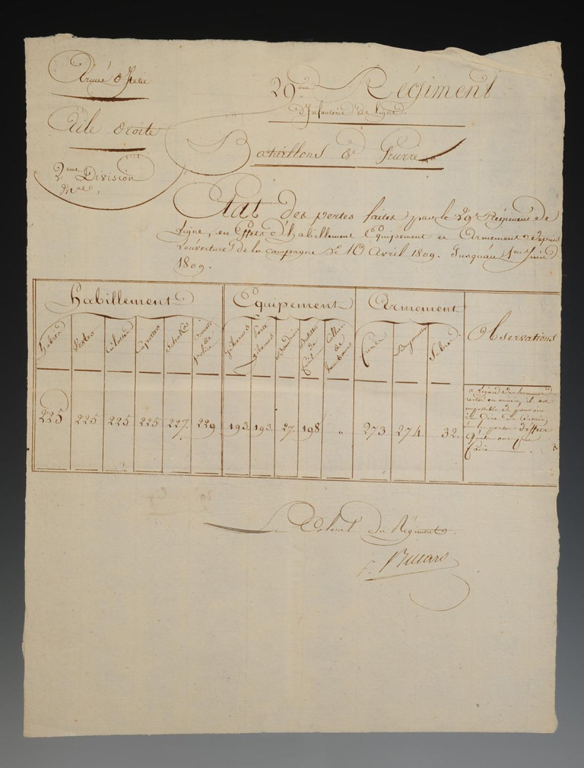État des pertes faites par le 29ème Régiment de ligne en effets d'habillement, équipements et armement depuis l'ouverture de la campagne le 10 avril 1809 jusqu'au 1er juin 1809.