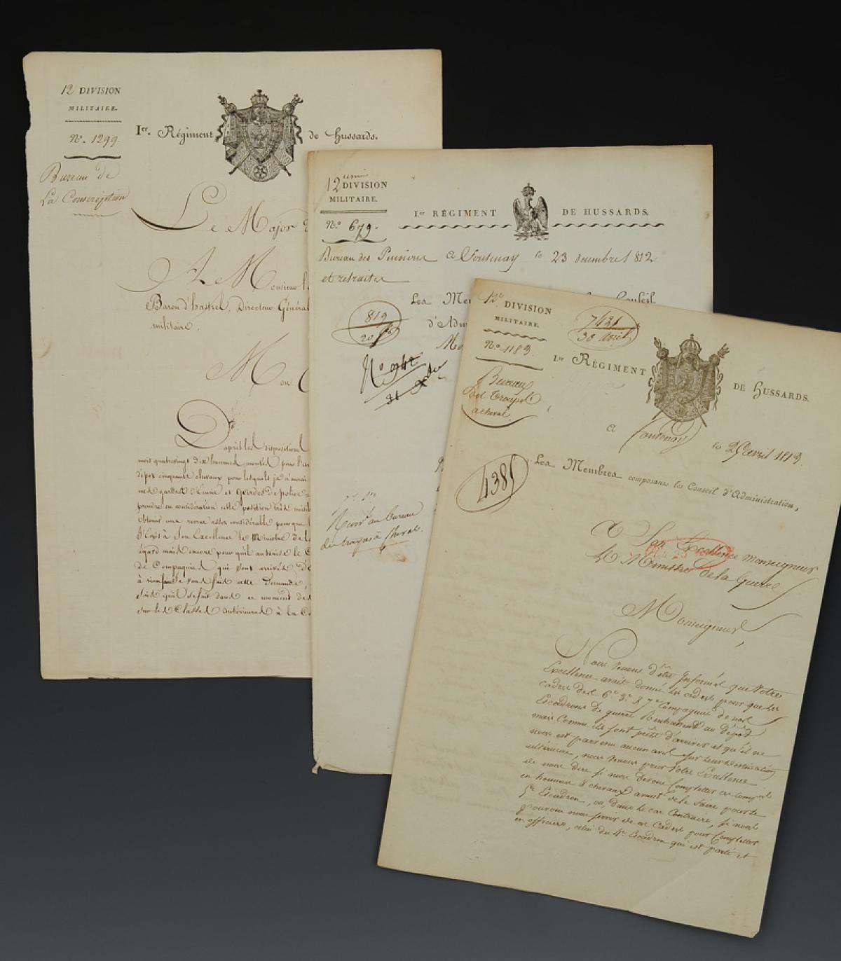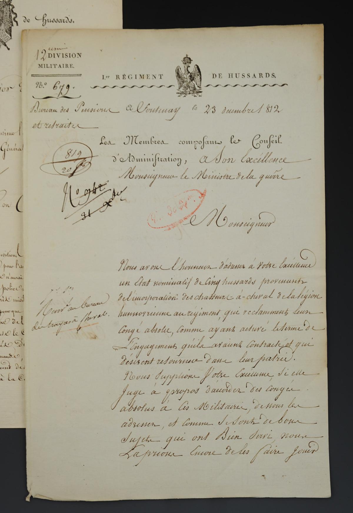 1er Régiment de Hussards. 12è Division Militaire. DEUX LETTRES DU CONSEIL D'ADMINISTRATION, L'une (1812) demandant le congé absolu pour des militaires en droit de le recevoir, la seconde (1813) faisant été de places restées vacantes dans certains escadrons. 18911-3
