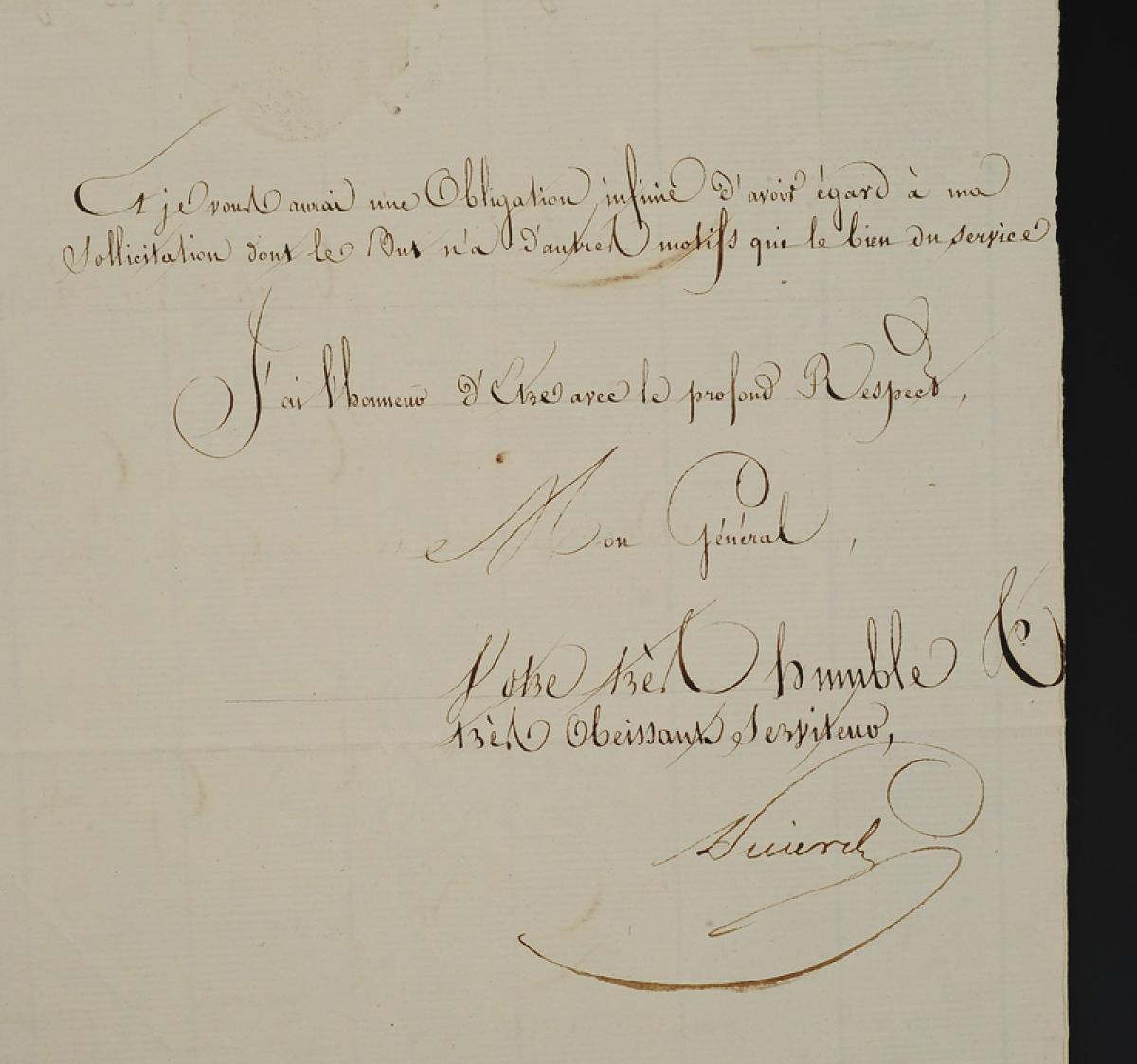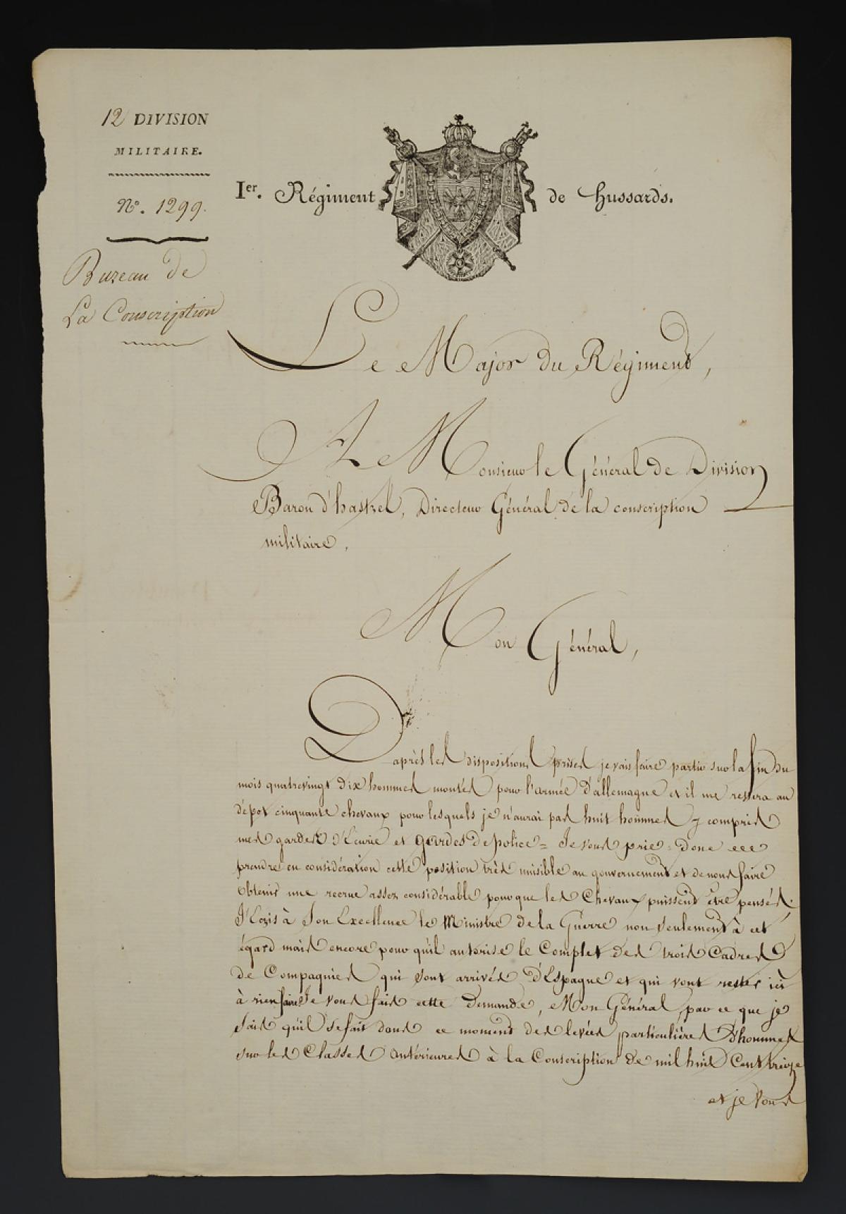- Est jointe une troisième lettre de ce régiment, non datée, à entête « Bureau de la Conscription » écrite par le Major du Régiment à Monsieur le Général de Division Baron d'Haskel, Directeur Général de la conscription militaire.