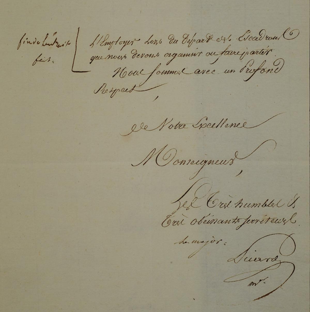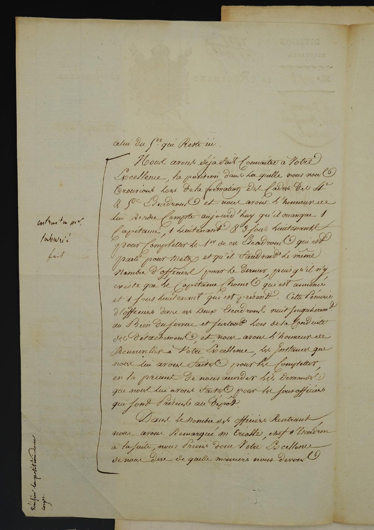 Le Major écrit : « Nous venons d'être informés que Votre Excellence avait donné les ordres pour que mes cadres des 6e, 3e et 7e Compagnies de nos Escadrons de guerre rentrassent au dépôt mais comme ils sont prêts d'arriver et qu'il ne nous est parvenu aucun avis sur leur destination ultérieure, nous venons prier Votre Excellence de nous dire si nous devons compléter ces Compagnies en hommes et chevaux avant de le faire pour le 5e Escadron, ou, dans le cas contraire, si nous pouvons nous servir de ces cadres pour compléter en officiers celui du 4 Escadron qui est parti et celui du 5e qui reste ici ».