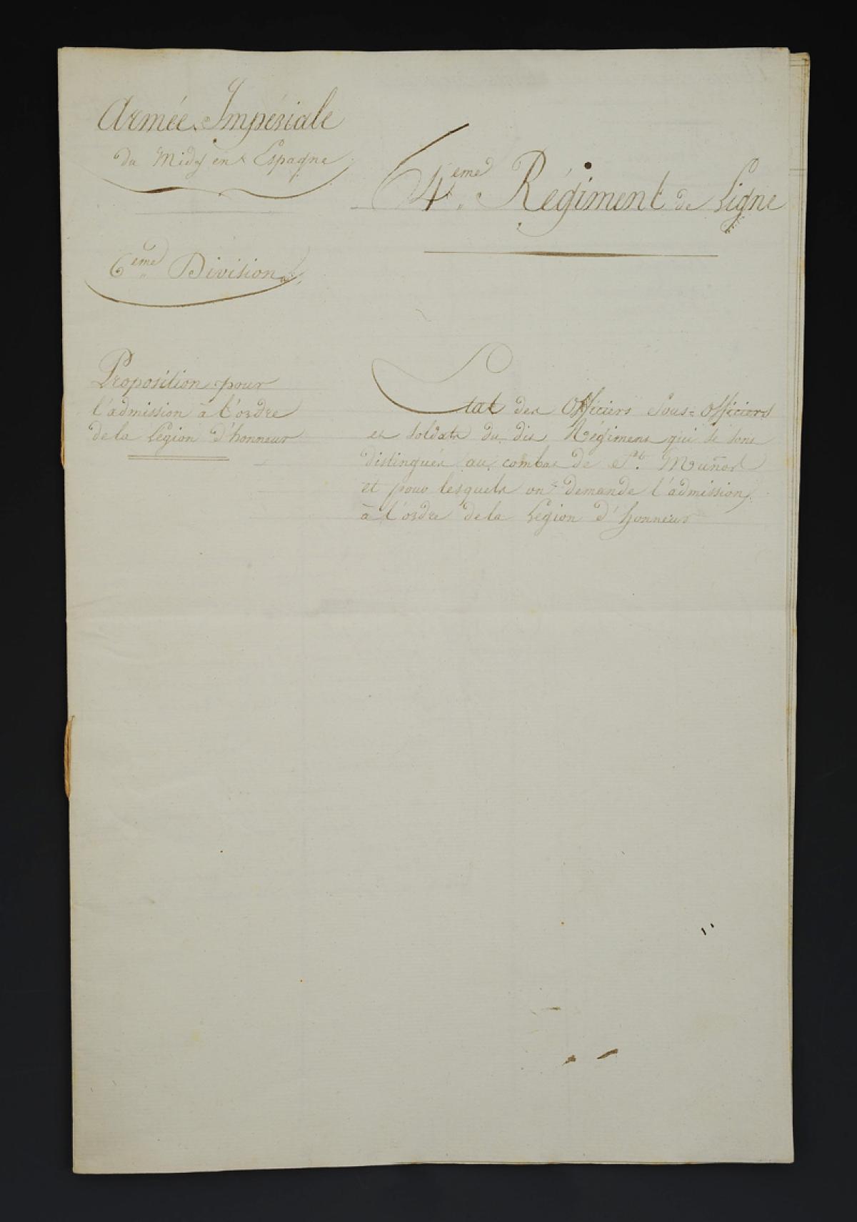 « État nominatif des officiers, sous-officiers et soldats du dit Régiment qui se sont distingués au combat de St Munoz et pour lesquels on demande l'admission à l'ordre de la Légion d'honneur »
