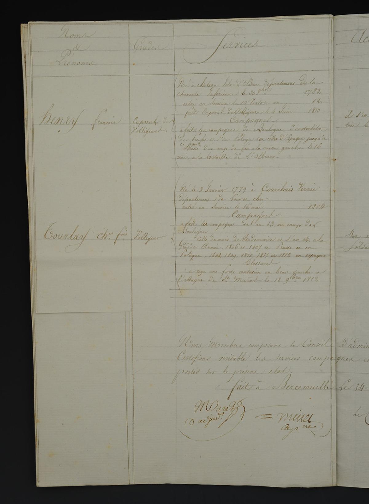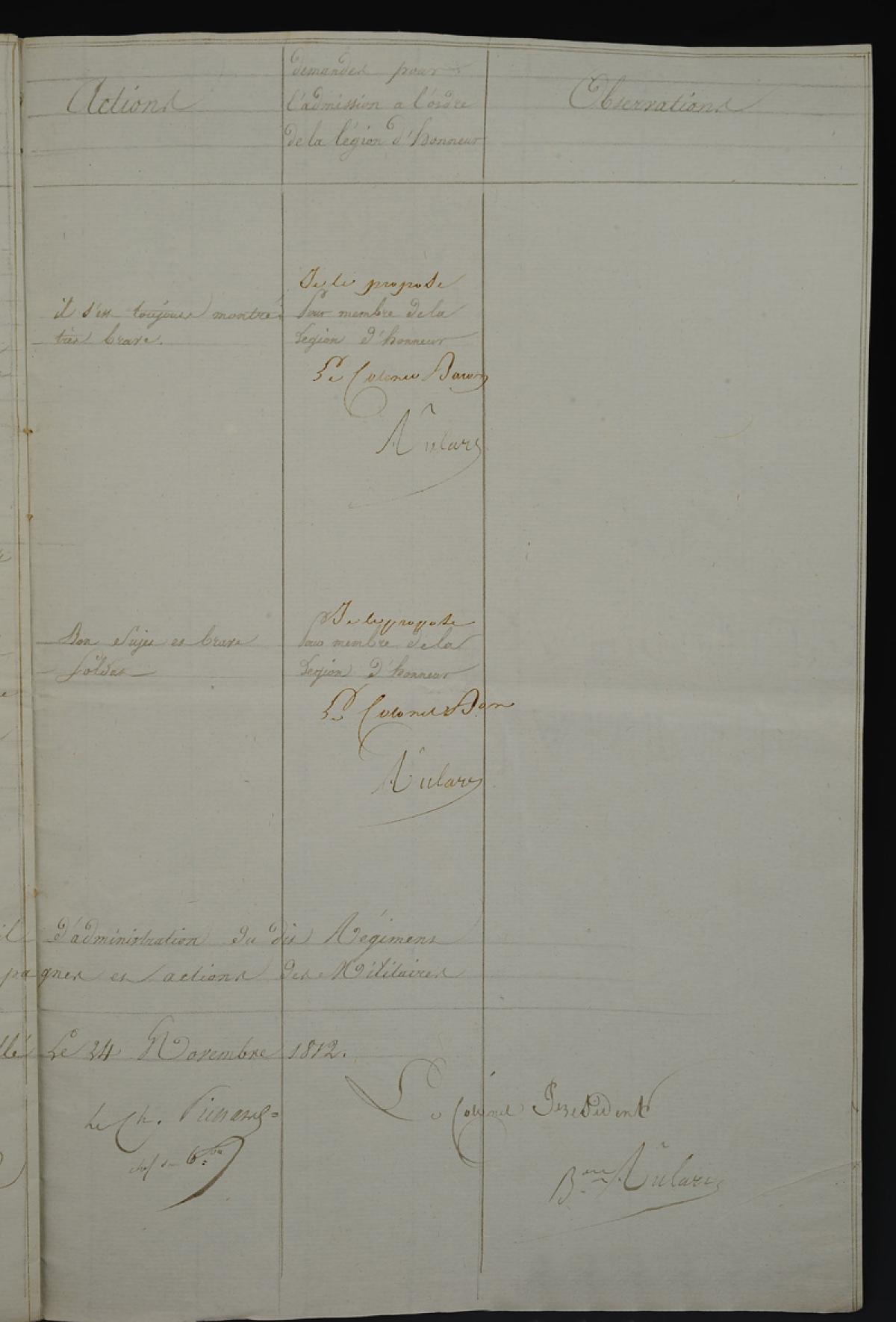 Bercemuelle le 24 novembre 1812. Signature du colonel Baron Aulard *