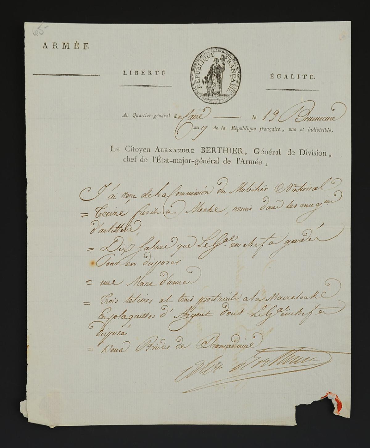Armée d'Orient. Quartier Général du Caire. LE CITOYEN ALEXANDRE BERTHIER, général de Division, chef de l'État-major-général de l'Armée accuse réception d'équipements de la part de la Commission du Mobilier National, 19 brumaire an 7 (9 novembre 1798). 18910-10