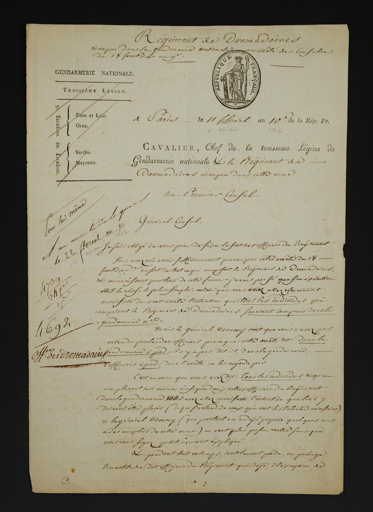Régiment de Dromadaires incorporé dans la Gendarmerie nationale. LETTRE AUTOGRAPHE SIGNÉE CAVALIER AU PREMIER CONSUL pour la clarification des nominations d'officiers dans la Gendarmerie nationale et la situation avec le Régiment de Dromadaires, Paris le 11 floréal an 10 (1er mai 1802). 18910-12
