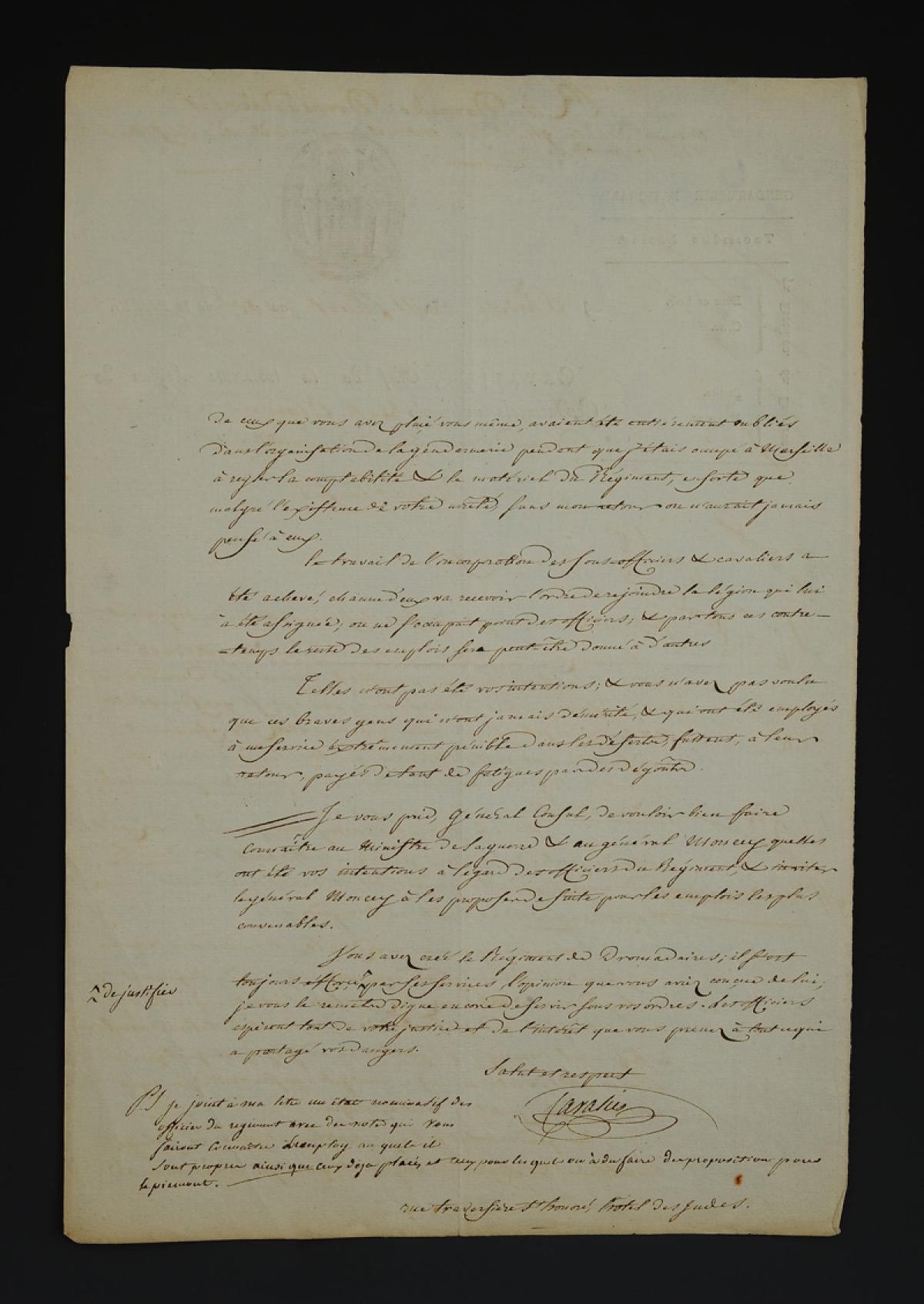 « C'est en vain que vous avez dit : Tous les individus (soulignés) et qu'en me plaçant moi même ainsi que deux autres officiers du Régiment dans la gendarmerie vous avez assez manifesté l'intention que l'on s'y doivent être placés (ce qui s'entend de ceux qui ont les statures nécessaires) : le général Moncey (qu pourtant en a déjà proposé quelques uns à des emplois de cette arme) ne veut plus passer outre sans que vous vous soyez positivement expliqué.