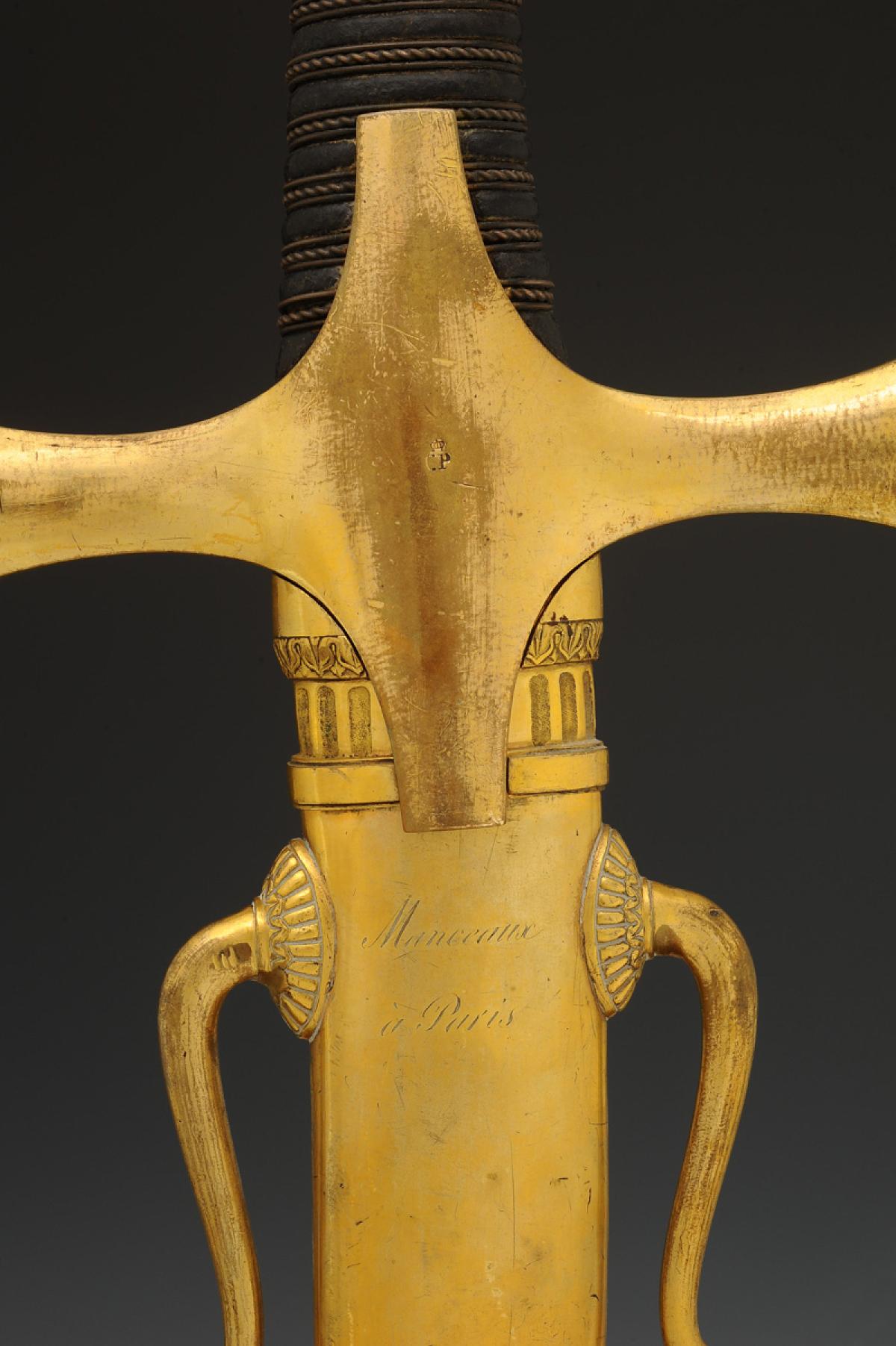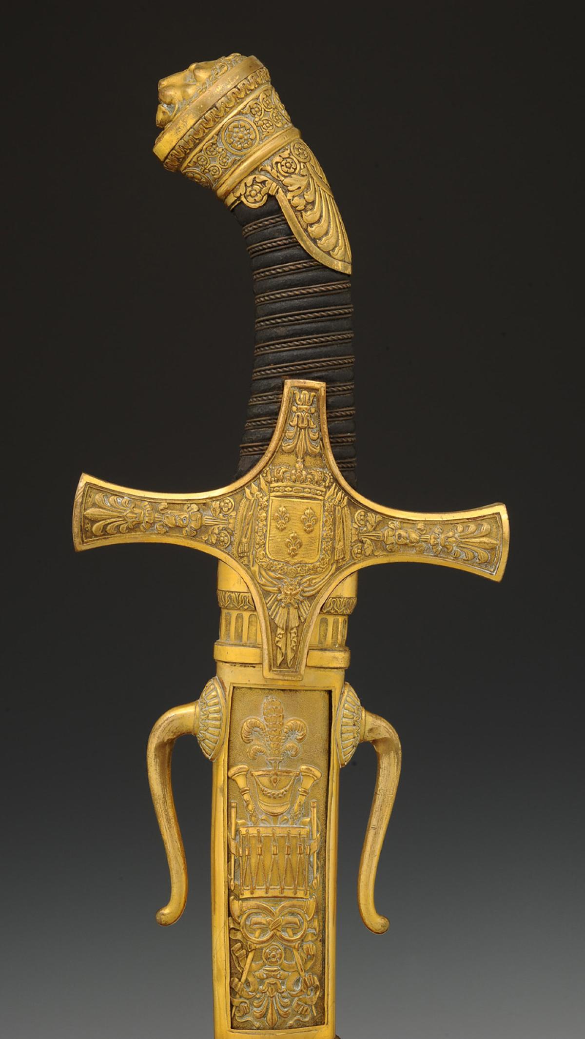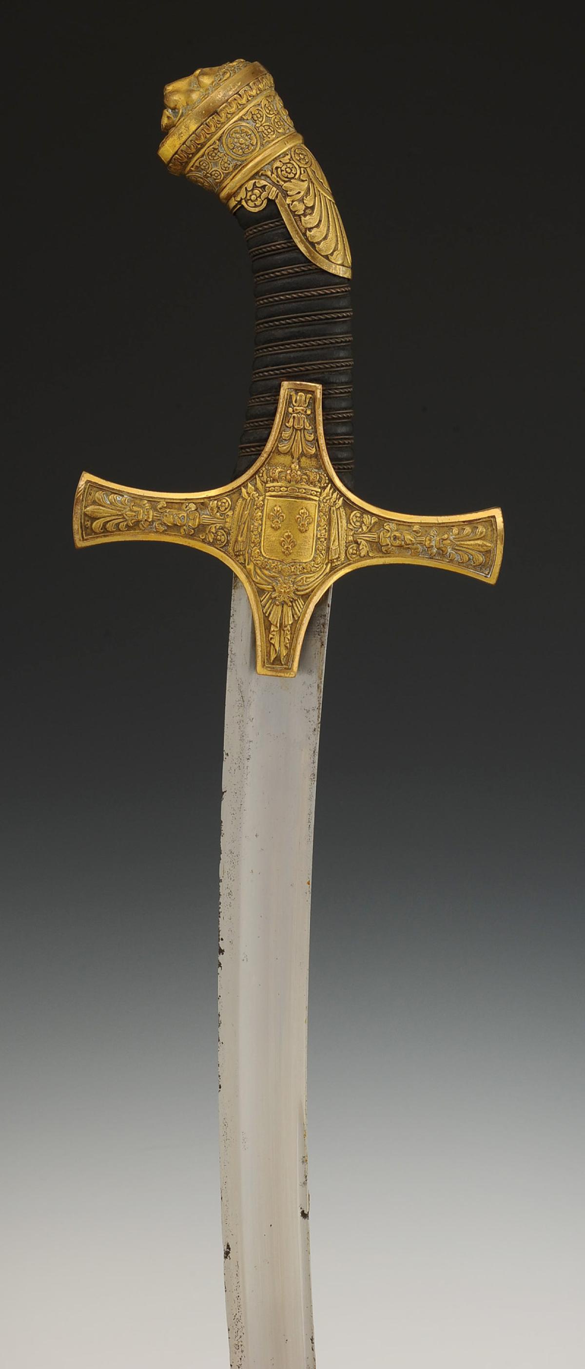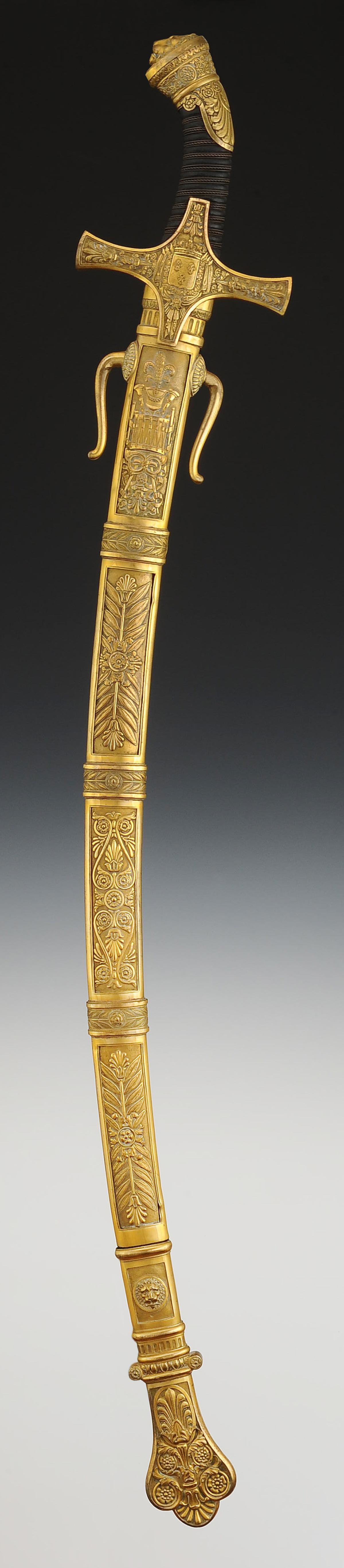 Monture « à la Turque ». Calotte à courte queue, moulée de fleurs et rosaces et feuilles d'acanthe, à couvercle en tête de lion. Poignée de bois gainé de cuir filigrané de cuivre argenté. Croisière symétrique moulée au centre du blason royal, unie au revers. Lame de cavalerie légère unie à pans creux et gouttières, longueur 81,2 cm, marquée « Manufre Rale de Klingenthal 9bre 1823 ». Fourreau à fût de bois gainé de laiton ouvragé, à plaques estampées ajustées dans des fenêtres, la plaque supérieure flanquée des deux crochets de suspension est fondue et ciselée d'attributs : shako à plumet, tambour, hautbois, parmi des feuillages et autres arabesques ; fourreau signé à l'arrière de la chape « Manceaux / à Paris ». Trois bracelets de renfort présente une course de lauriers. Le bout de laiton fondu est ciselé des deux côtés avec une tête de lion à l'extérieur.