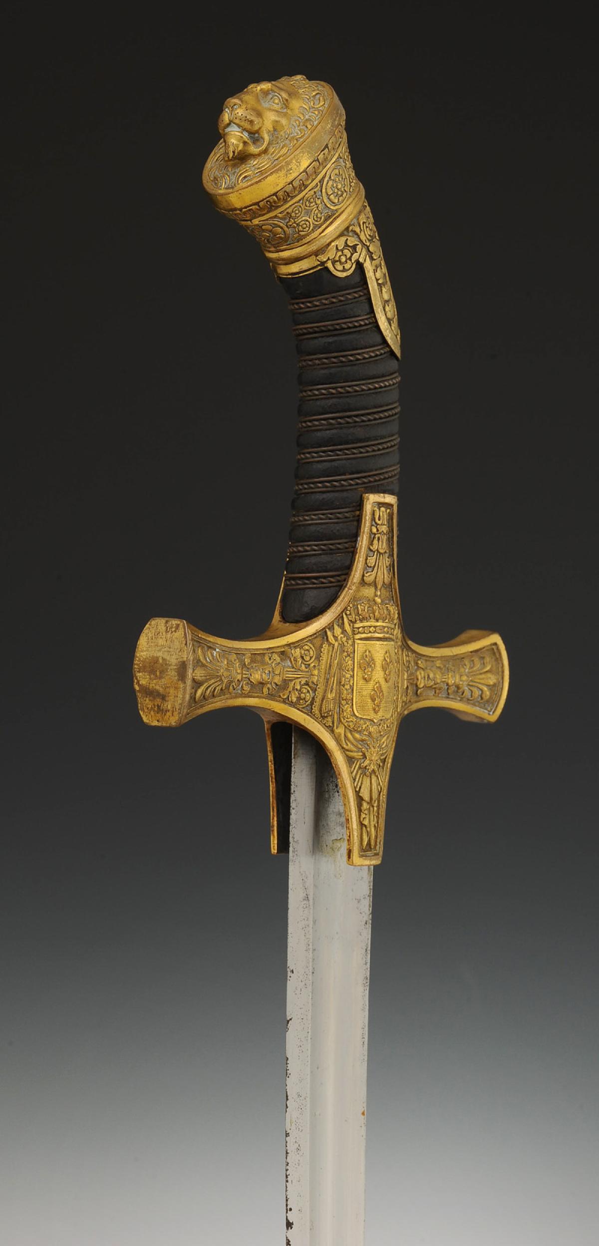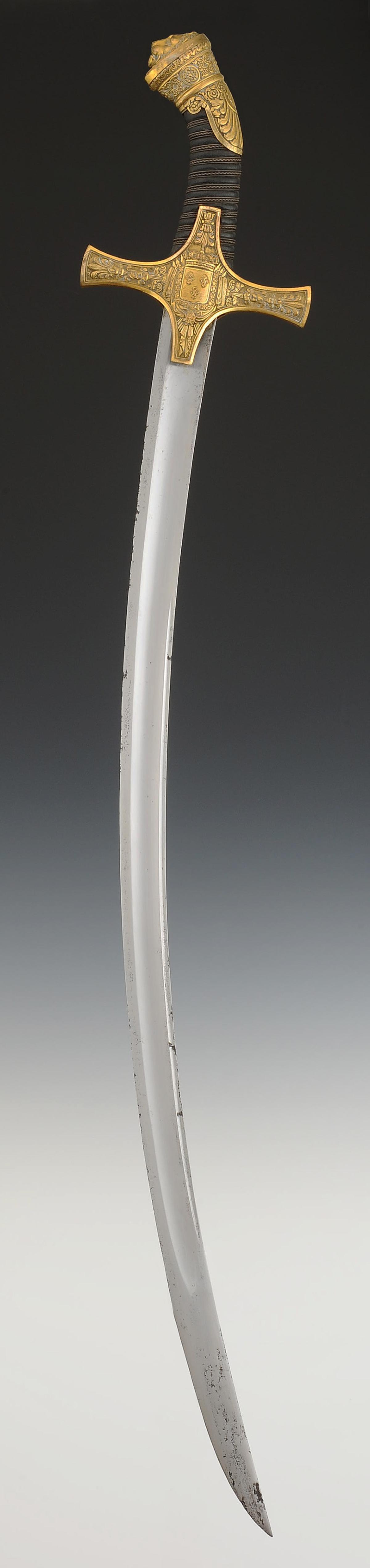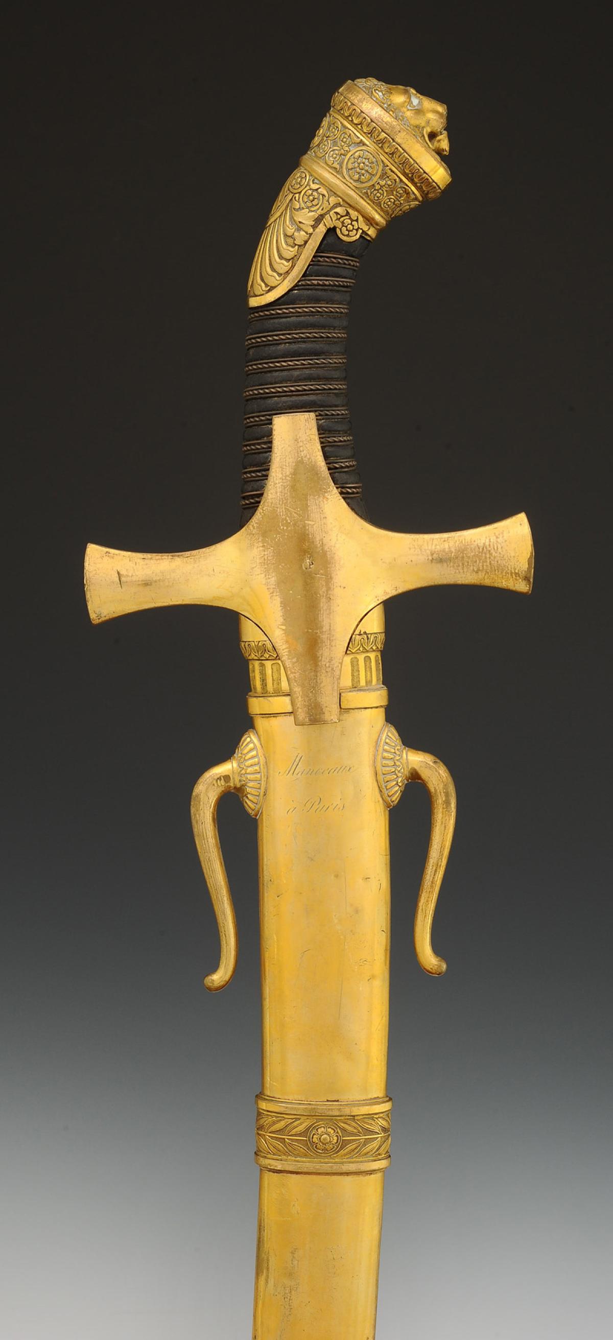 Monture « à la Turque ». Calotte à courte queue, moulée de fleurs et rosaces et feuilles d'acanthe, à couvercle en tête de lion. Poignée de bois gainé de cuir filigrané de cuivre argenté. Croisière symétrique moulée au centre du blason royal, unie au revers. Lame de cavalerie légère unie à pans creux et gouttières, longueur 81,2 cm, marquée « Manufre Rale de Klingenthal 9bre 1823 ». Fourreau à fût de bois gainé de laiton ouvragé, à plaques estampées ajustées dans des fenêtres, la plaque supérieure flanquée des deux crochets de suspension est fondue et ciselée d'attributs : shako à plumet, tambour, hautbois, parmi des feuillages et autres arabesques ; fourreau signé à l'arrière de la chape « Manceaux / à Paris ». Trois bracelets de renfort présente une course de lauriers. Le bout de laiton fondu est ciselé des deux côtés avec une tête de lion à l'extérieur.