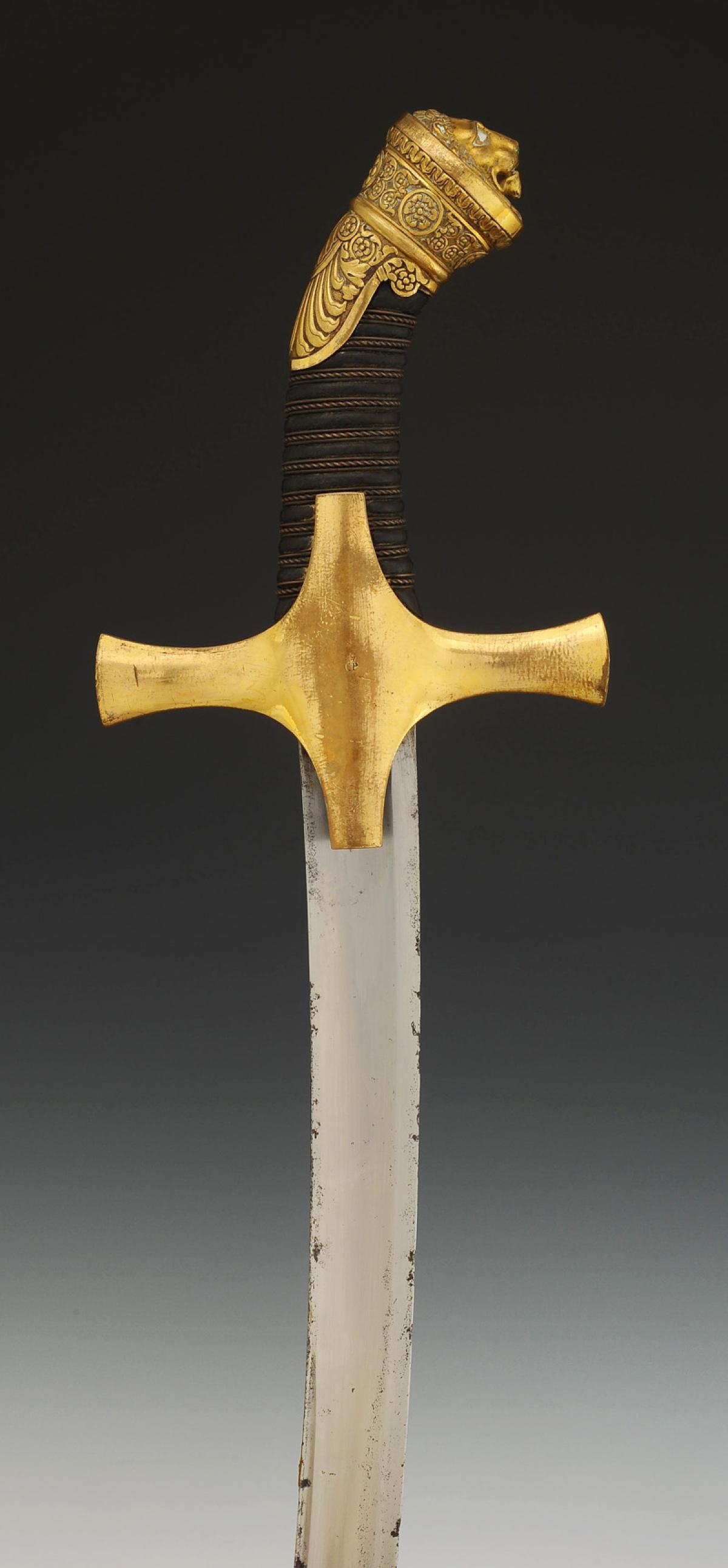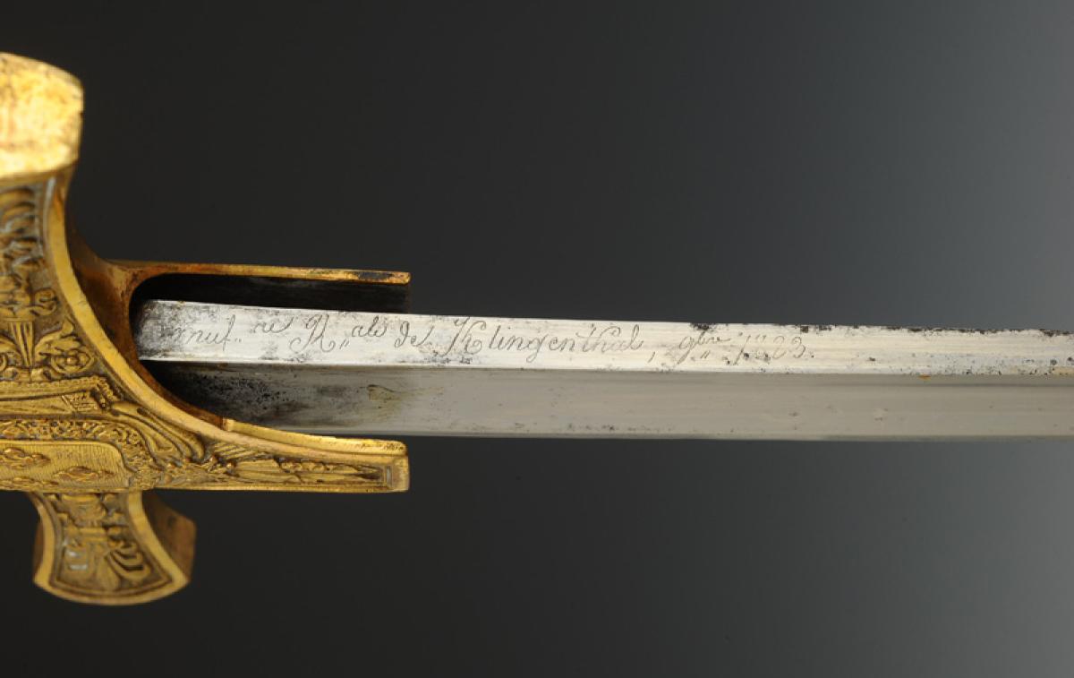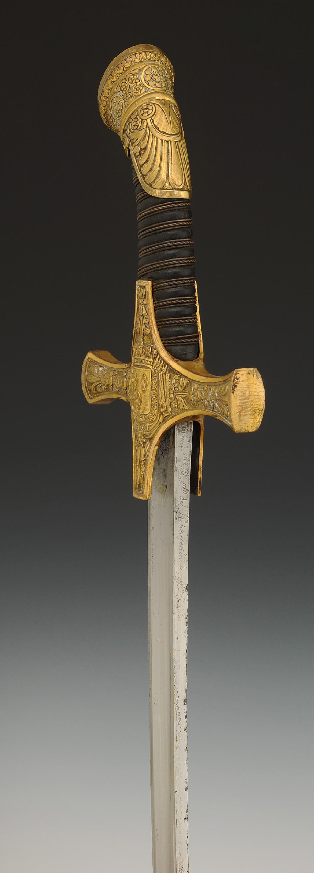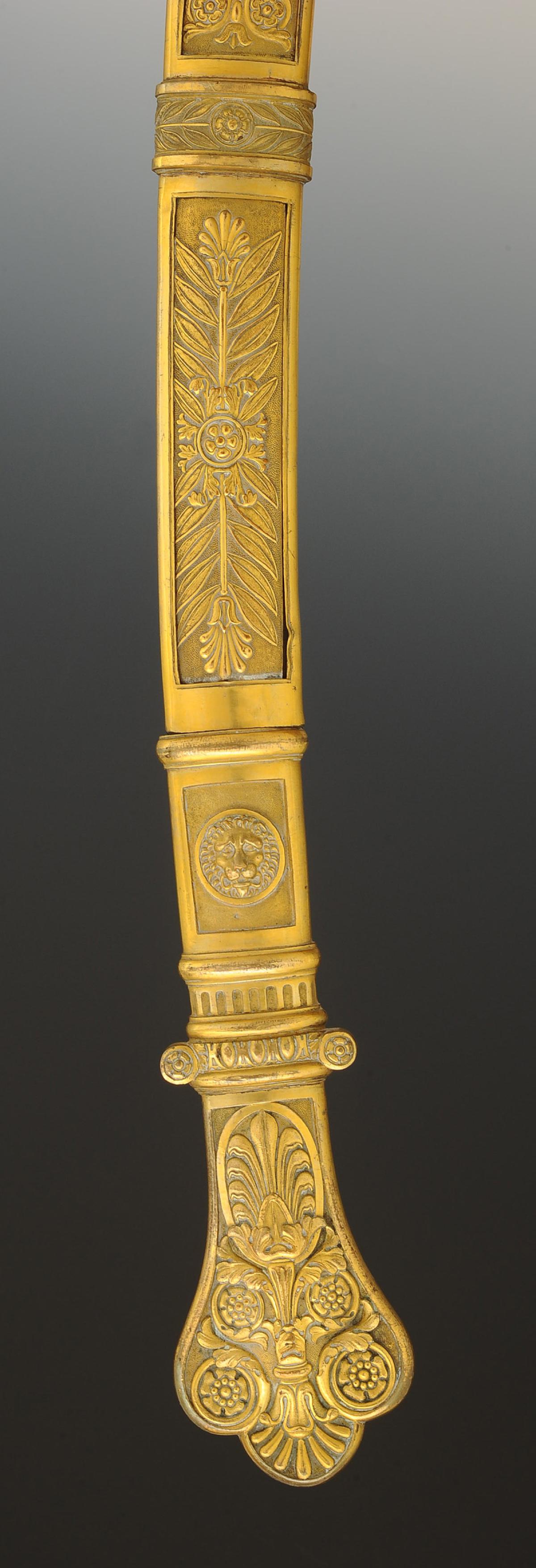 Monture « à la Turque ». Calotte à courte queue, moulée de fleurs et rosaces et feuilles d'acanthe, à couvercle en tête de lion. Poignée de bois gainé de cuir filigrané de cuivre argenté. Croisière symétrique moulée au centre du blason royal, unie au revers. Lame de cavalerie légère unie à pans creux et gouttières, longueur 81,2 cm, marquée « Manufre Rale de Klingenthal 9bre 1823 ». Fourreau à fût de bois gainé de laiton ouvragé, à plaques estampées ajustées dans des fenêtres, la plaque supérieure flanquée des deux crochets de suspension est fondue et ciselée d'attributs : shako à plumet, tambour, hautbois, parmi des feuillages et autres arabesques ; fourreau signé à l'arrière de la chape « Manceaux / à Paris ». Trois bracelets de renfort présente une course de lauriers. Le bout de laiton fondu est ciselé des deux côtés avec une tête de lion à l'extérieur.
