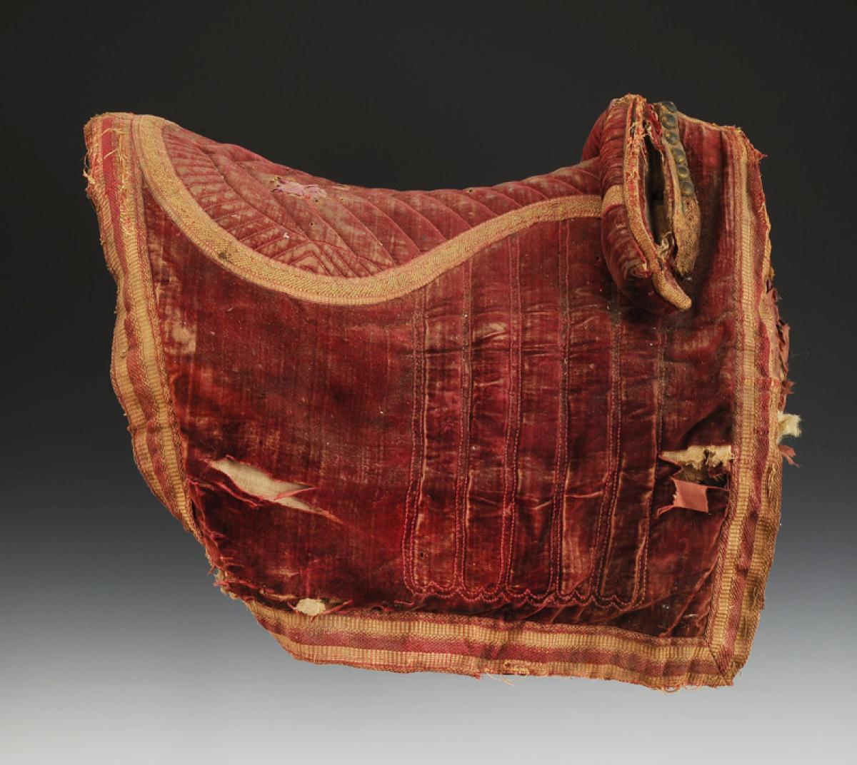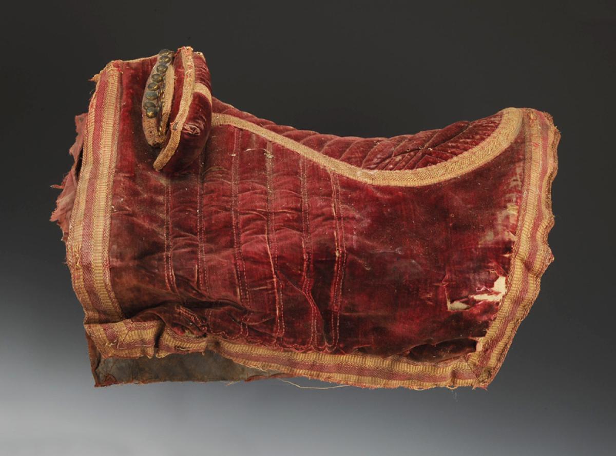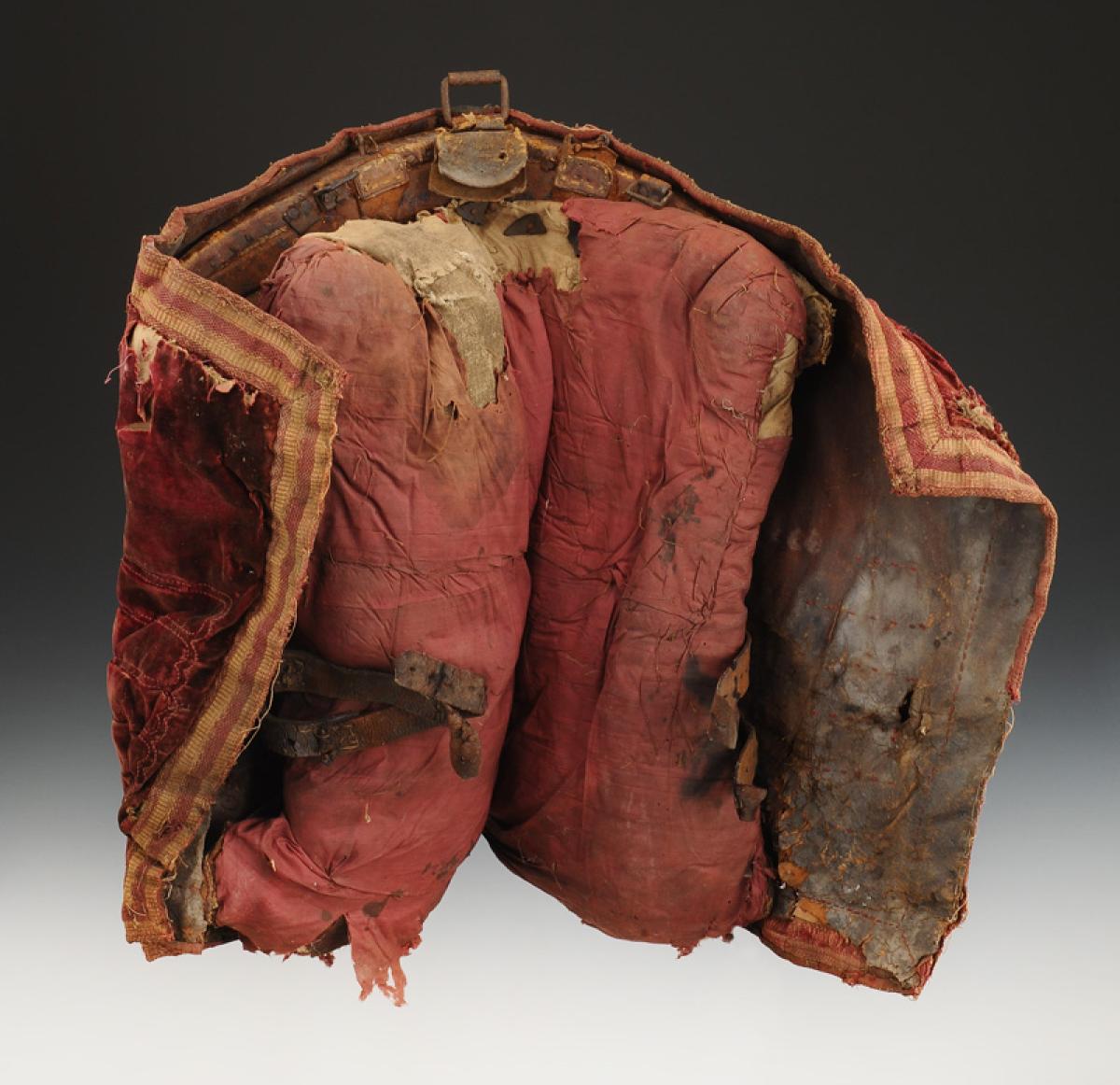 Entièrement en velours cramoisi, galons de fils rouge et clous en laiton doré (ayant perdu leur dorure).