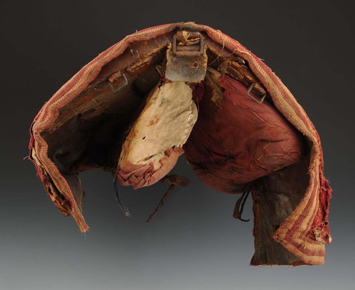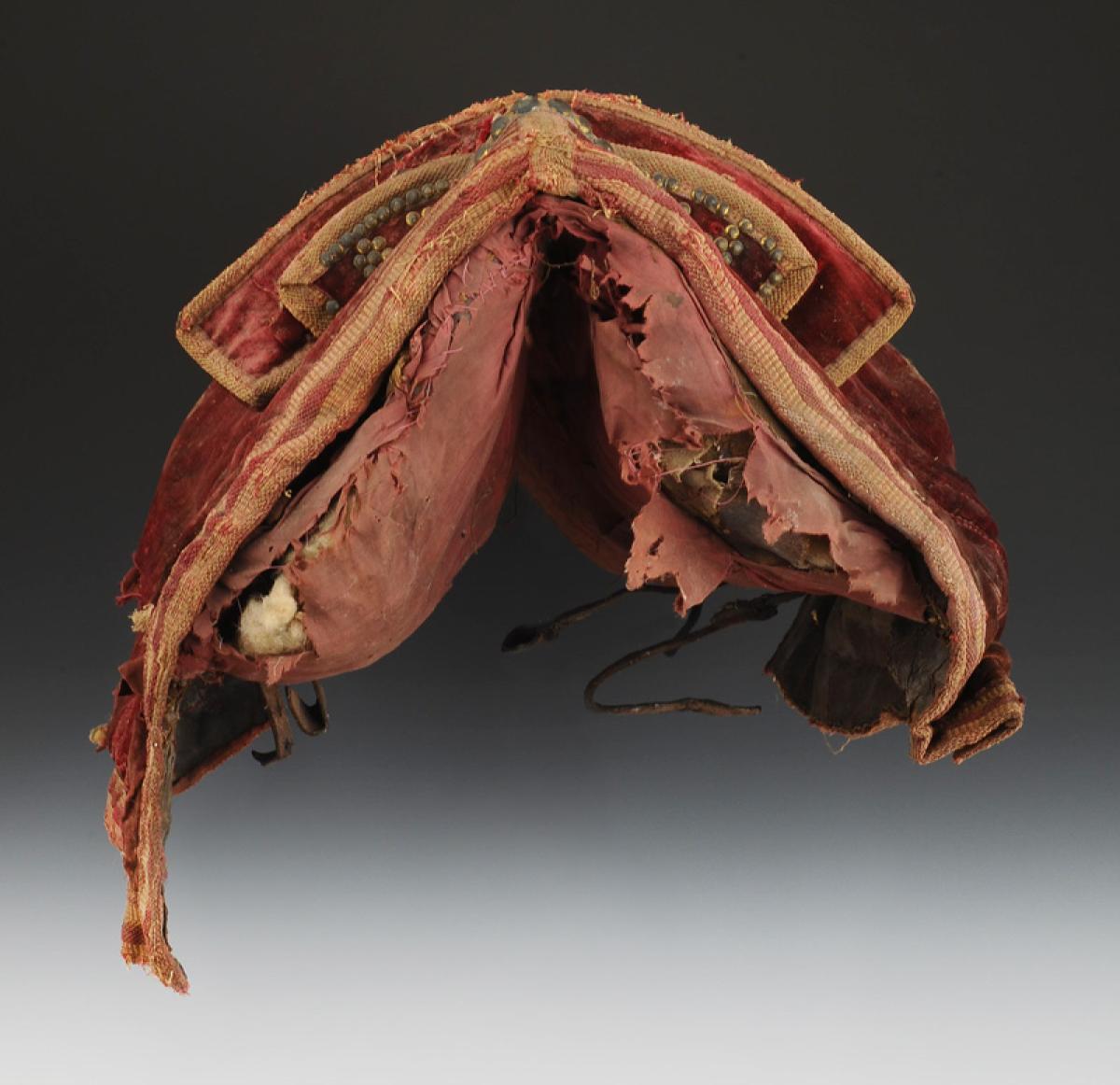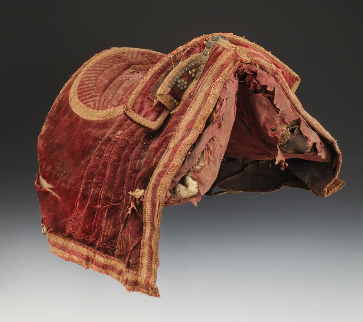Entièrement en velours cramoisi, galons de fils rouge et clous en laiton doré (ayant perdu leur dorure).