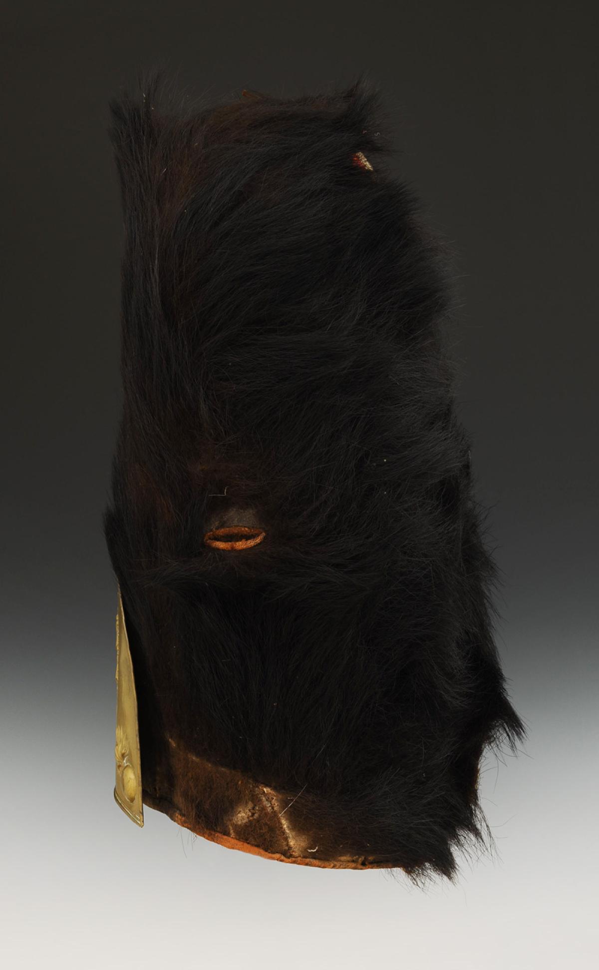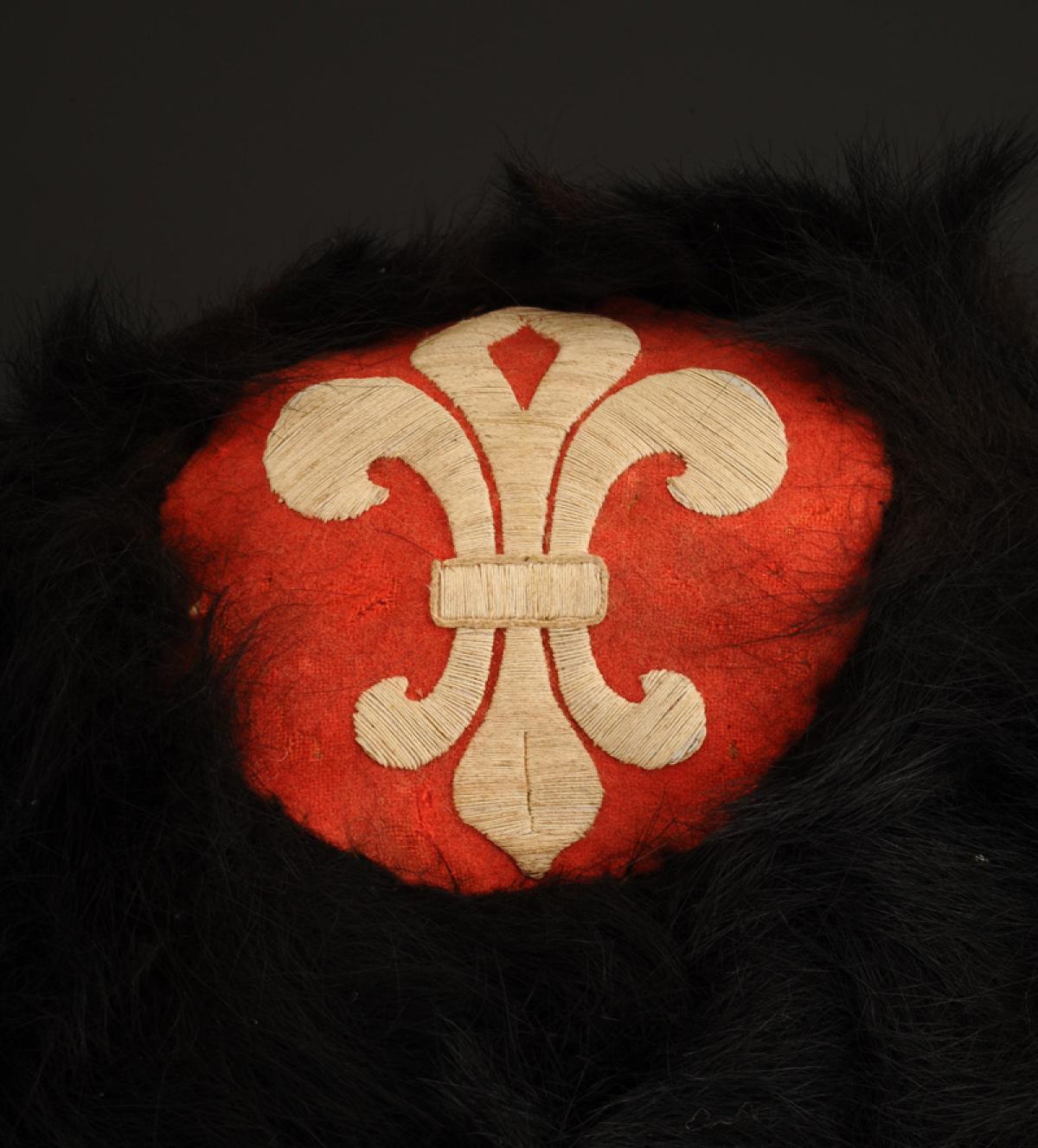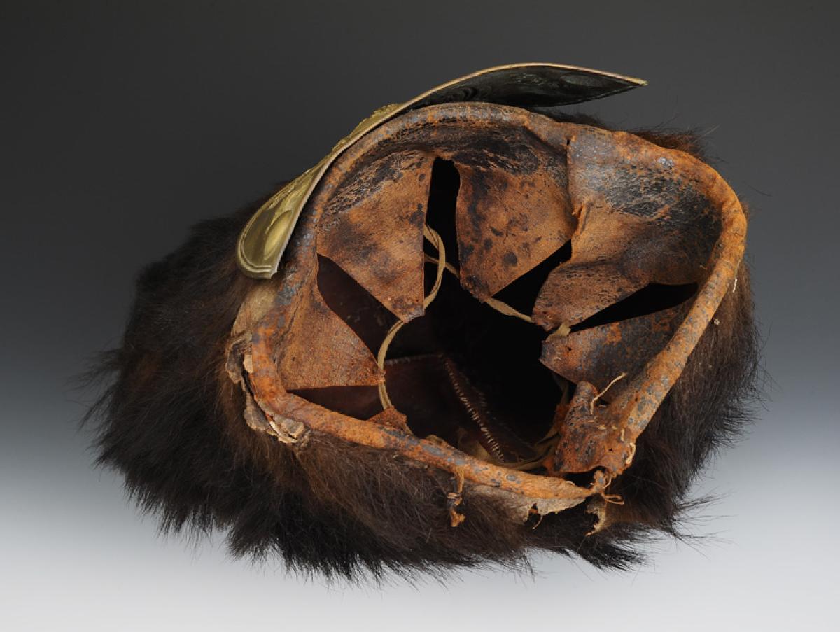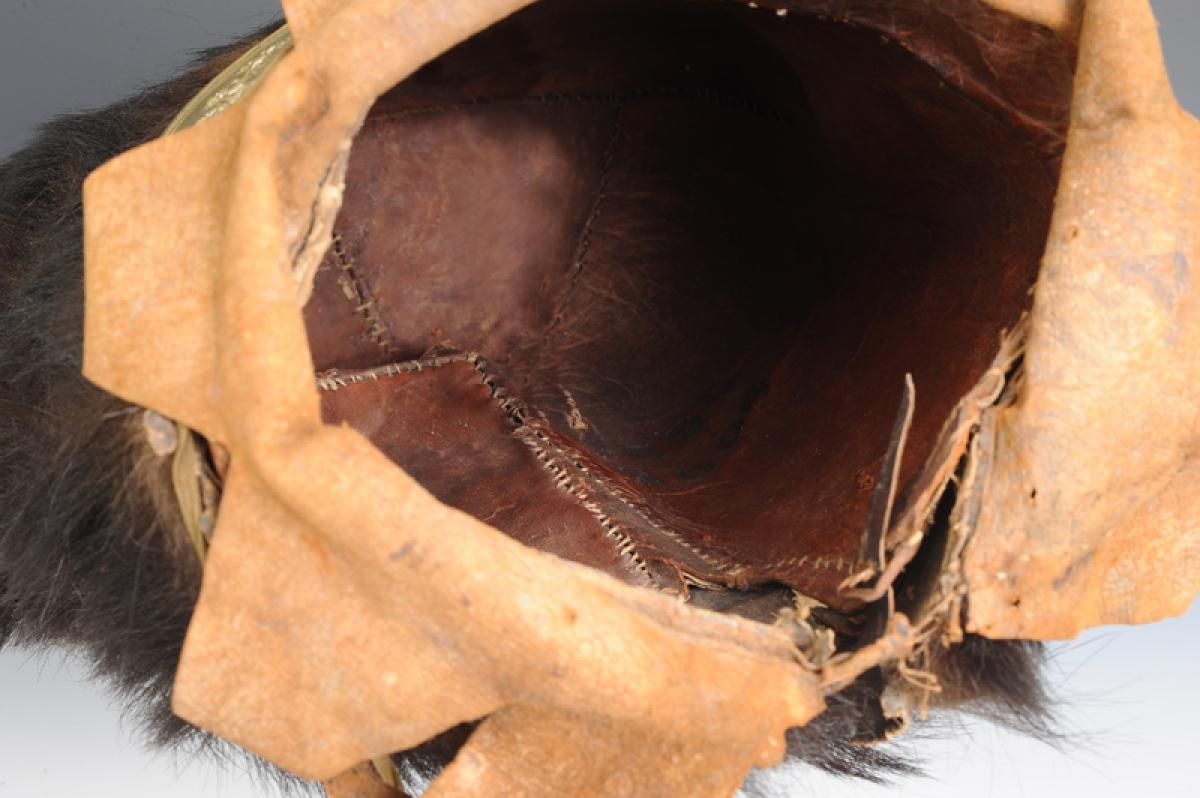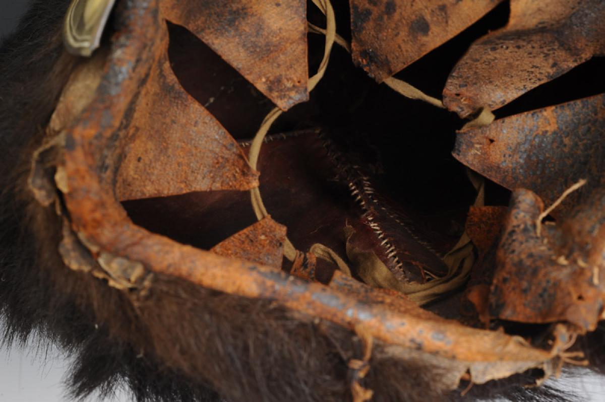 Coiffe intérieure en basane cirée noir (H 120 mm) découpée en sept dents de loup. L'extrémité des pointes de dents de loup est repliée sur elle-même permettant le passage du lacet destiné à l'ajustage de la coiffe. Le bord inférieur de la coiffe est replié à l’extérieur de la carcasse, par dessus la peau d’ours, sur une hauteur de 10 mm et il est cousu.