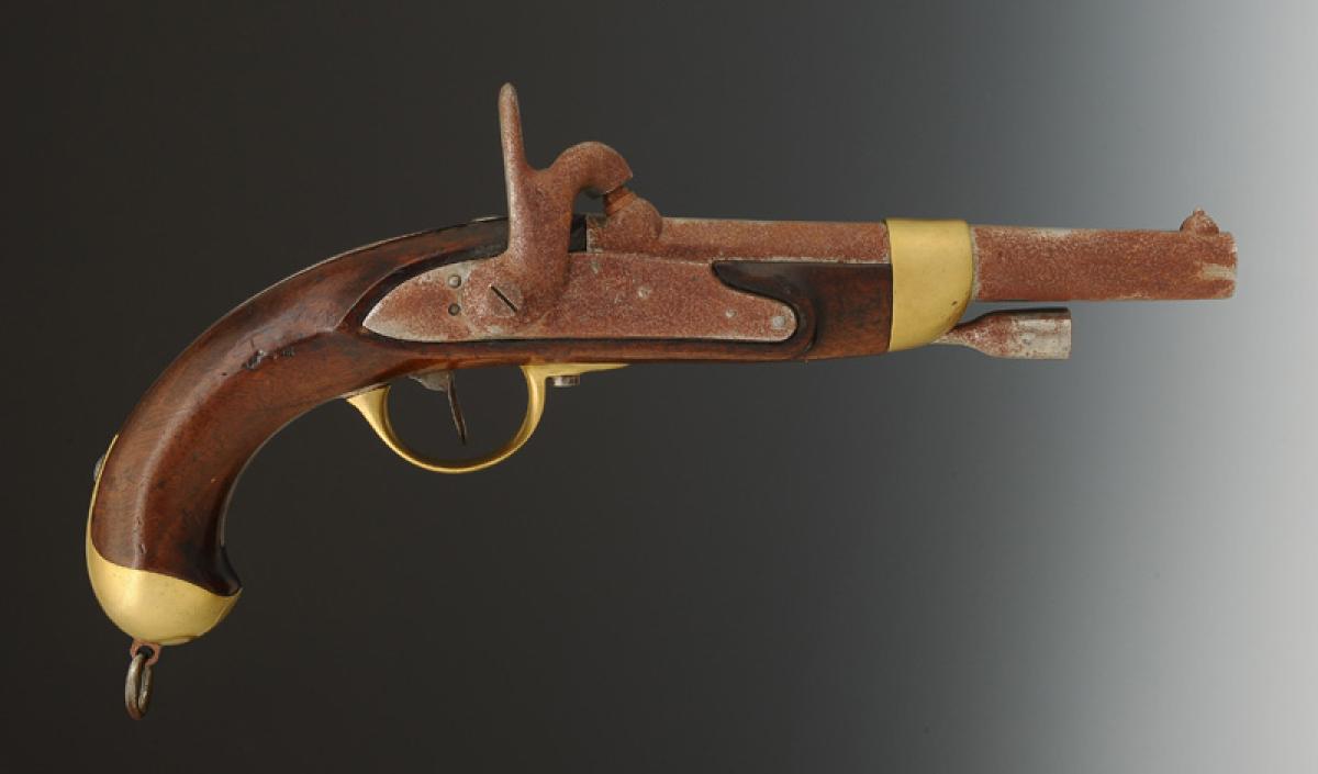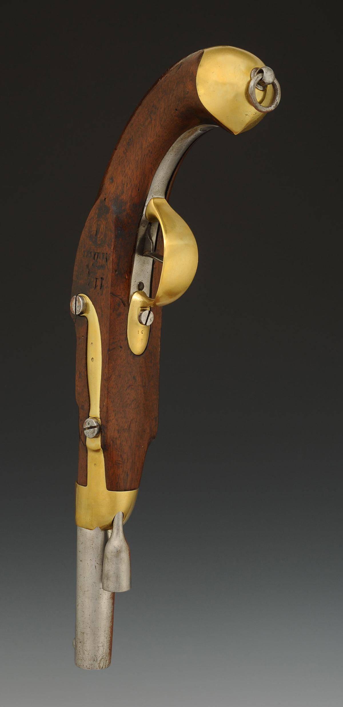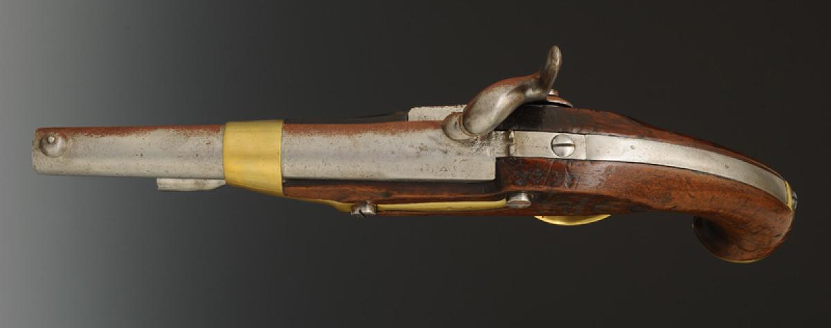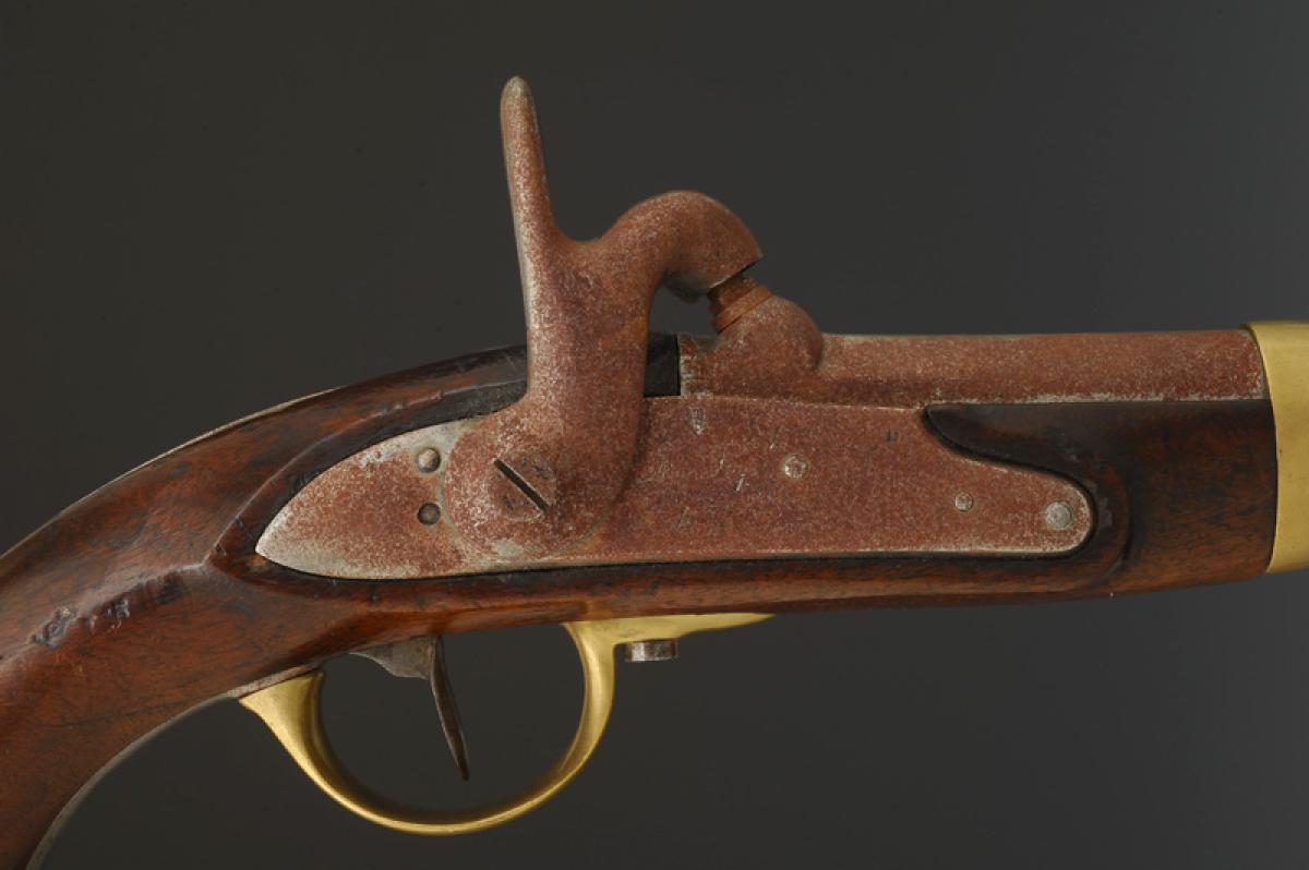 Pistolet à percussion, canon à cinq pans courts (marquage difficilement lisible). Longueur du canon 19,9 cm. Queue de culasse gravée « 1822 ... », longueur avec la queue de culasse 23,8 cm. Monture en noyer avec crosse légèrement pentée, matriculée « 118 » et « St ETIENNE », garnitures en laiton, calotte à anneau en acier, sous-garde en fer. Platine à percussion poinçonnée « B » sous couronne et signée « Manuf Imple de St Etienne ». Baguette du modèle.
