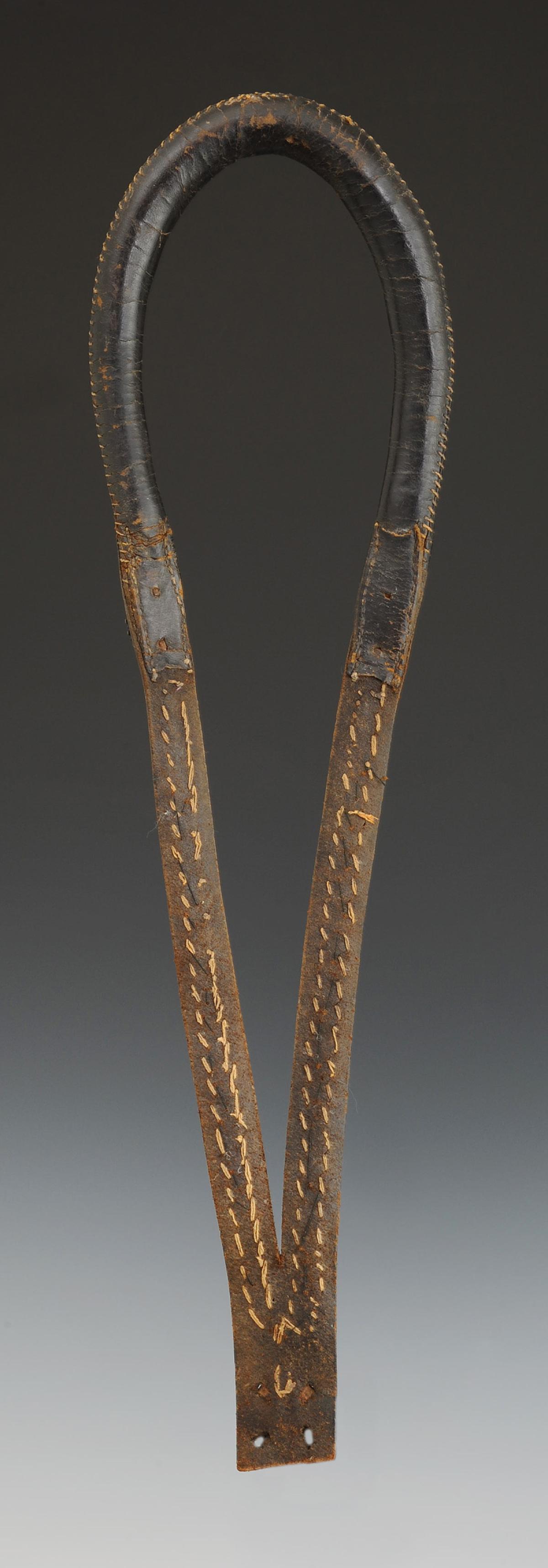 Croupière en cuir verni noir, longueur 41,5 cm, recouverte d'une chaînette gourmette en laiton et décorée de deux fleurons de forme ovale en laiton estampé.