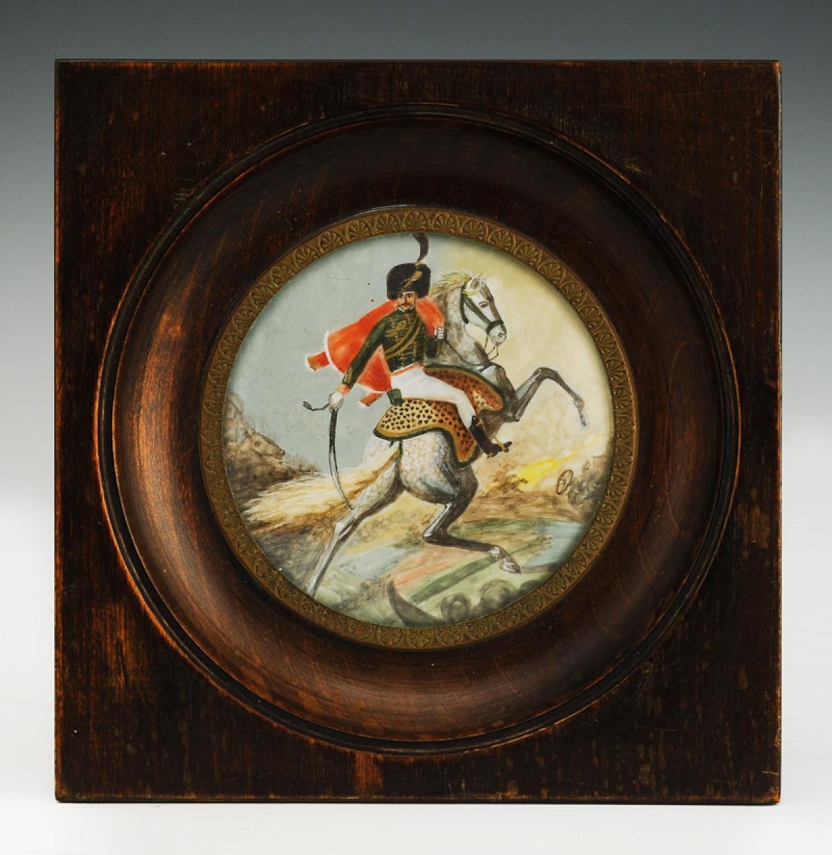 De forme ronde Ø 7,5 cm. Représentant le Prince Eugène en grand uniforme à cheval. Présenté sous verre chevet, baguette en laiton. Dans un cadre cuvette en bois verni, H 14 cm x 13,7 cm.