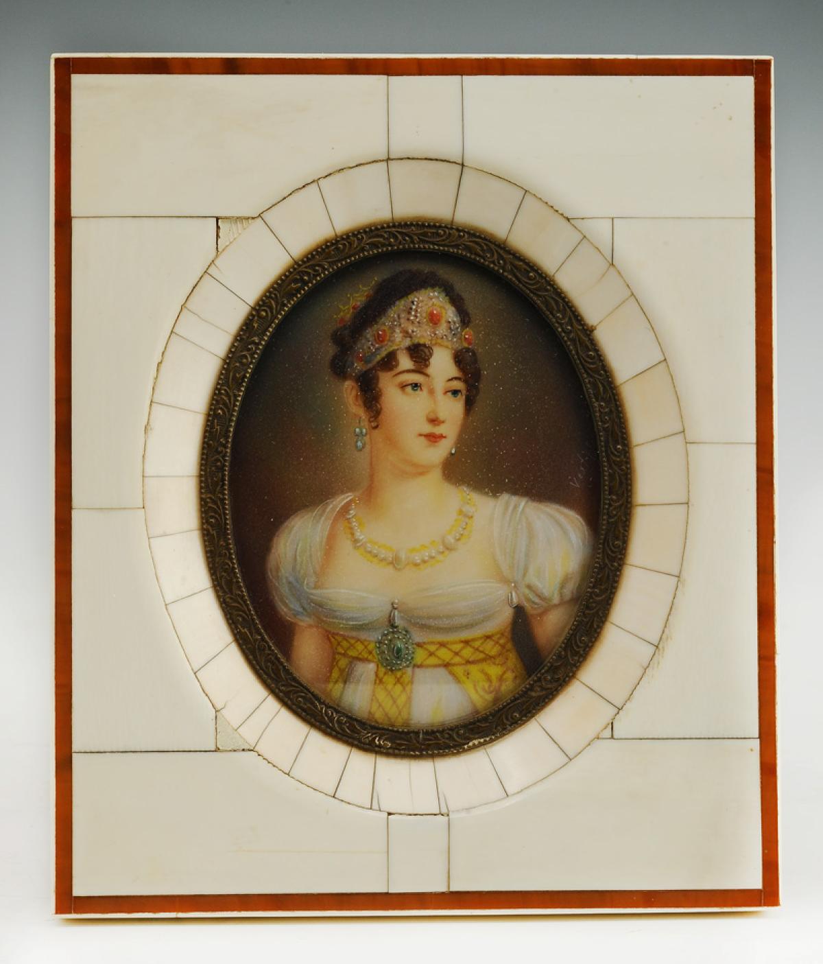 De forme ovale H 8 cm. x 6,2 cm. Représentant l'Impératrice Joséphine. Présenté sous verre chevet, baguette en laiton. Dans un cadre cuvette en bois recouvert de plaquettes d'os, H 14,2 cm x 12,2 cm.