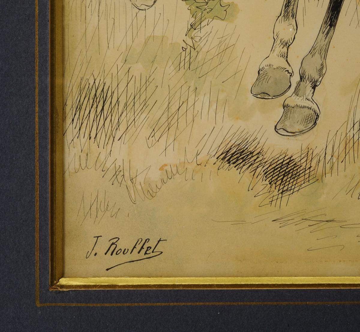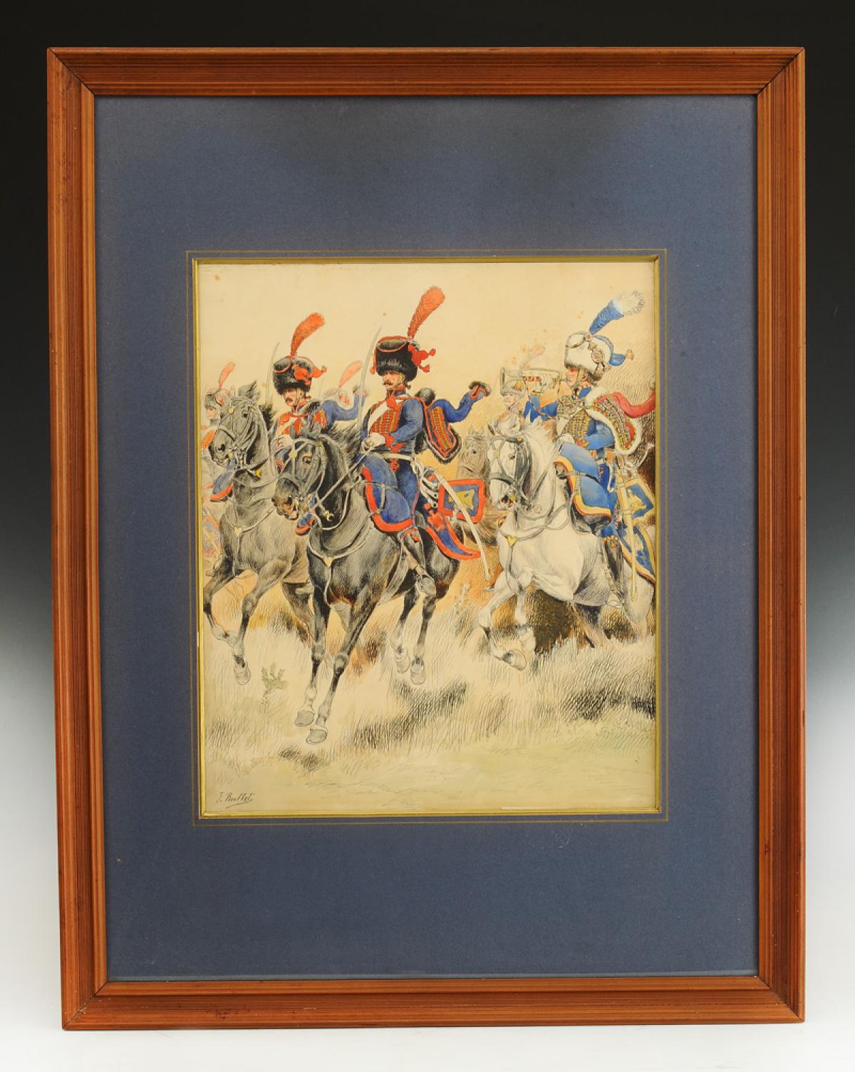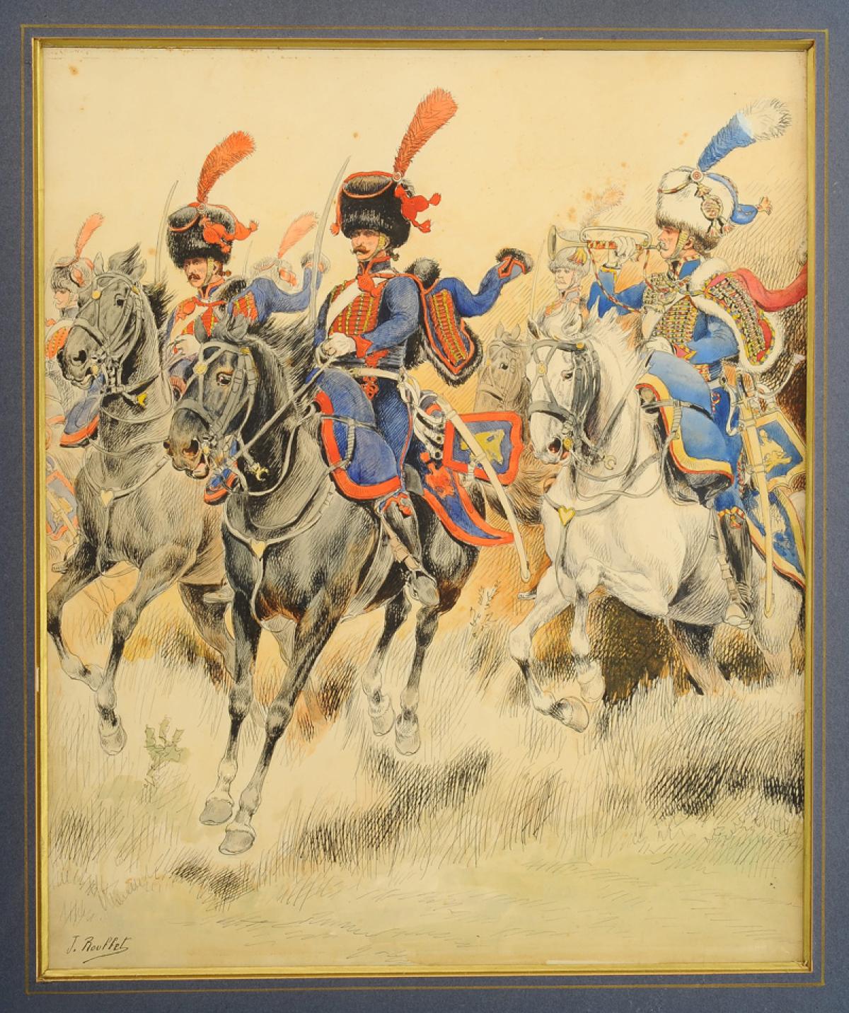H à vue 36 cm x 29,5 cm. Signée en bas à gauche « J. Rouffet ». Ensemble de cavaliers de l'artillerie à cheval de la Garde Impériale, soldats et trompettes. Présentée sous verre dans un encadrement moderne, H 63,5 cm x 49 cm.