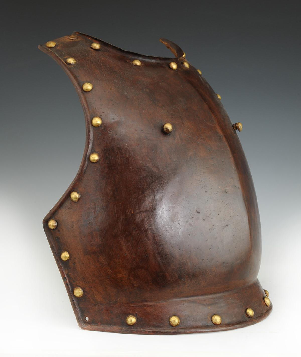 En tôle d'acier, bordé de 32 clous en laiton à tête demi-sphérique et 2 clous manquants et 2 clous au niveau de la poitrine destinés à attacher les épaulières. Au niveau du cou, la bordure est repliée sur l'extérieur ; sur tous les autres bords, elle est bordée d'une moulure saillante arrondie.