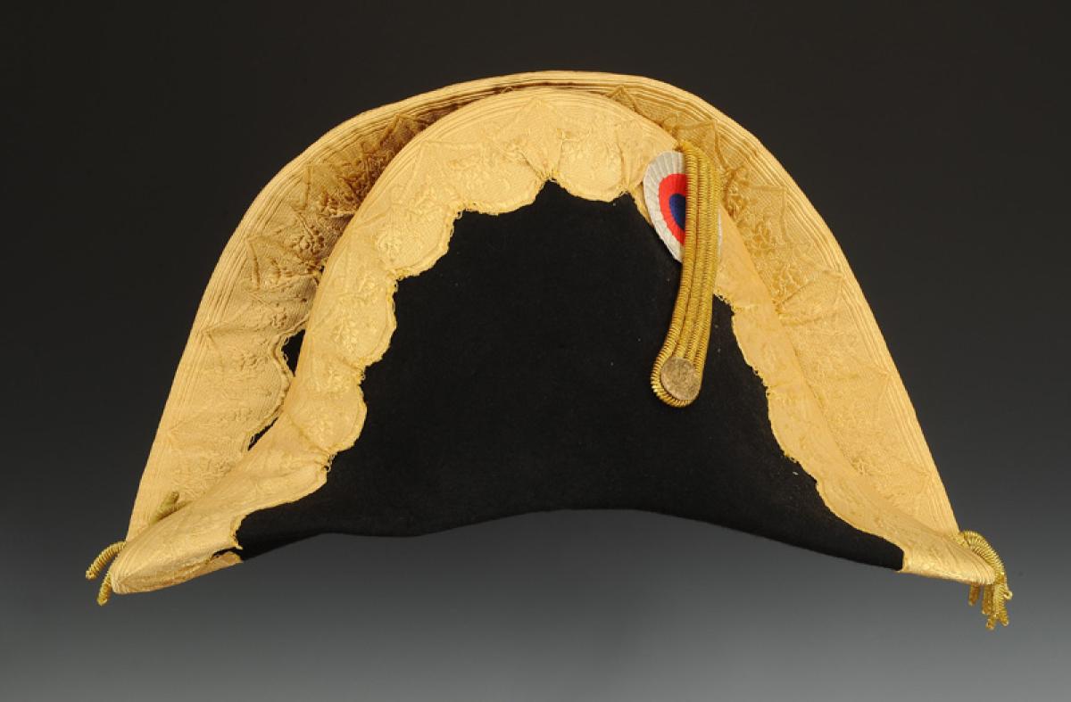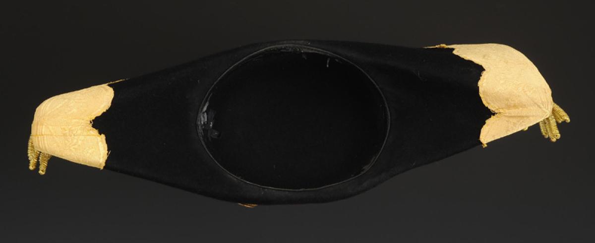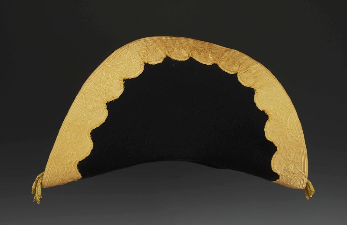 Chapeau en feutre noir bordé d'un galon doré (largeur 7,7 cm) à bords festonnés et crêtes, tissé d'une branche de chêne avec ses fruits.