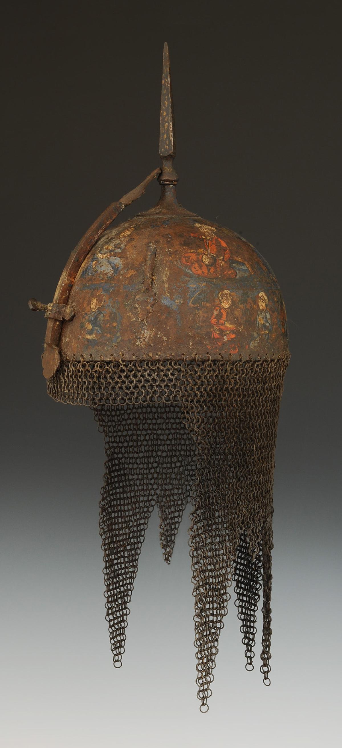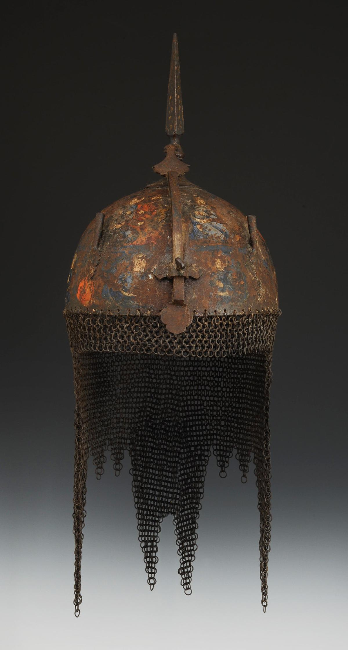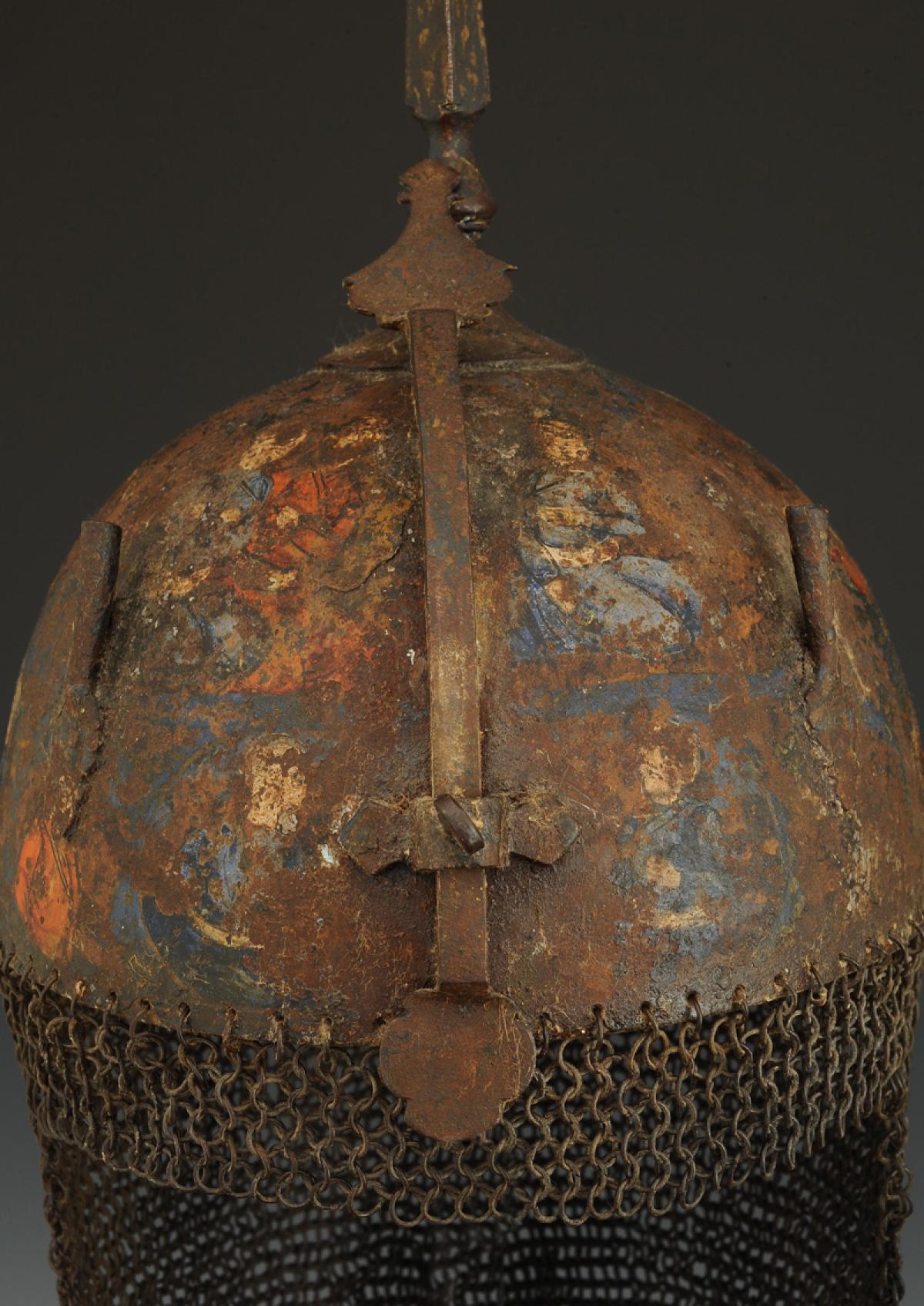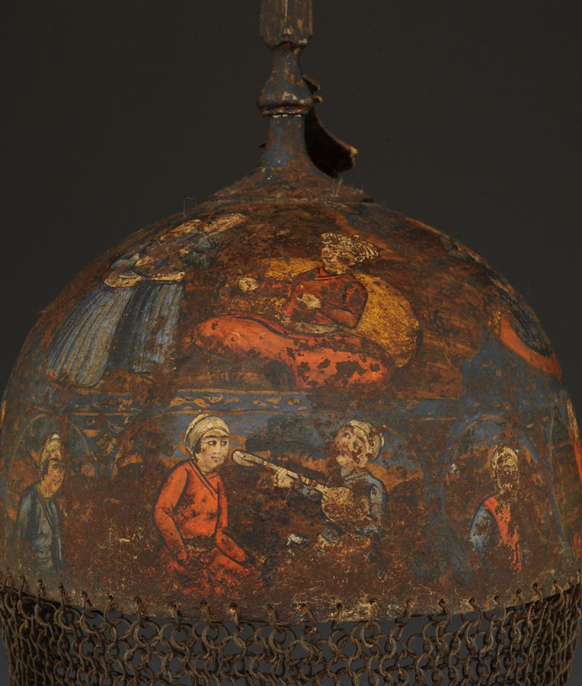 Casque oriental d'archer dit Kulah Khud. Timbre demi-sphérique en fer polychromé de personnages ottomans. Il est surmonté d'une pointe quadrangulaire et de deux porte-plumails. Nasal mobile. Camail à fine maille.