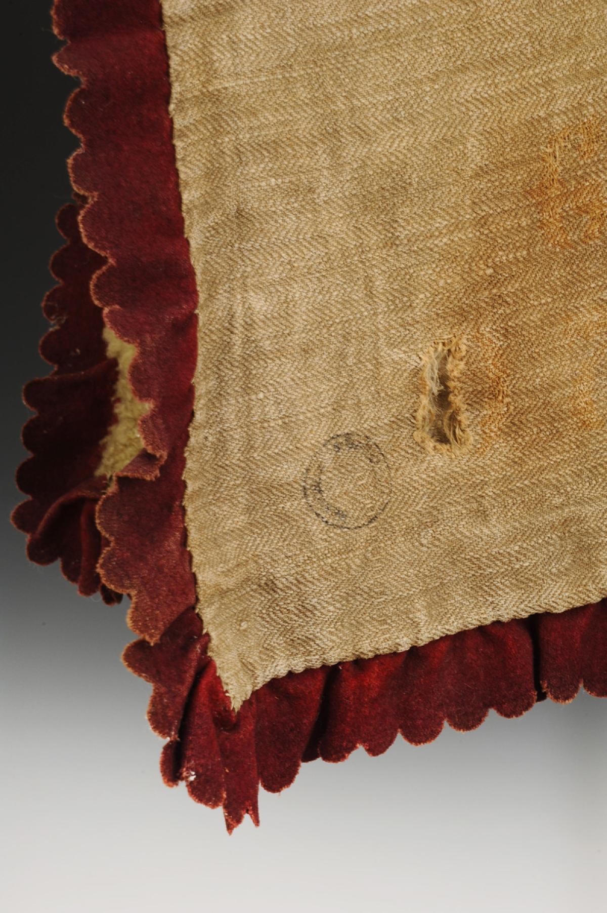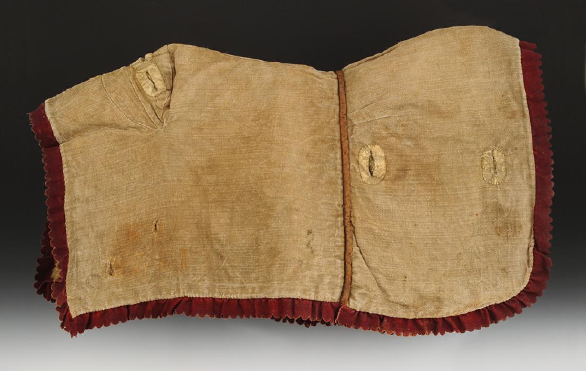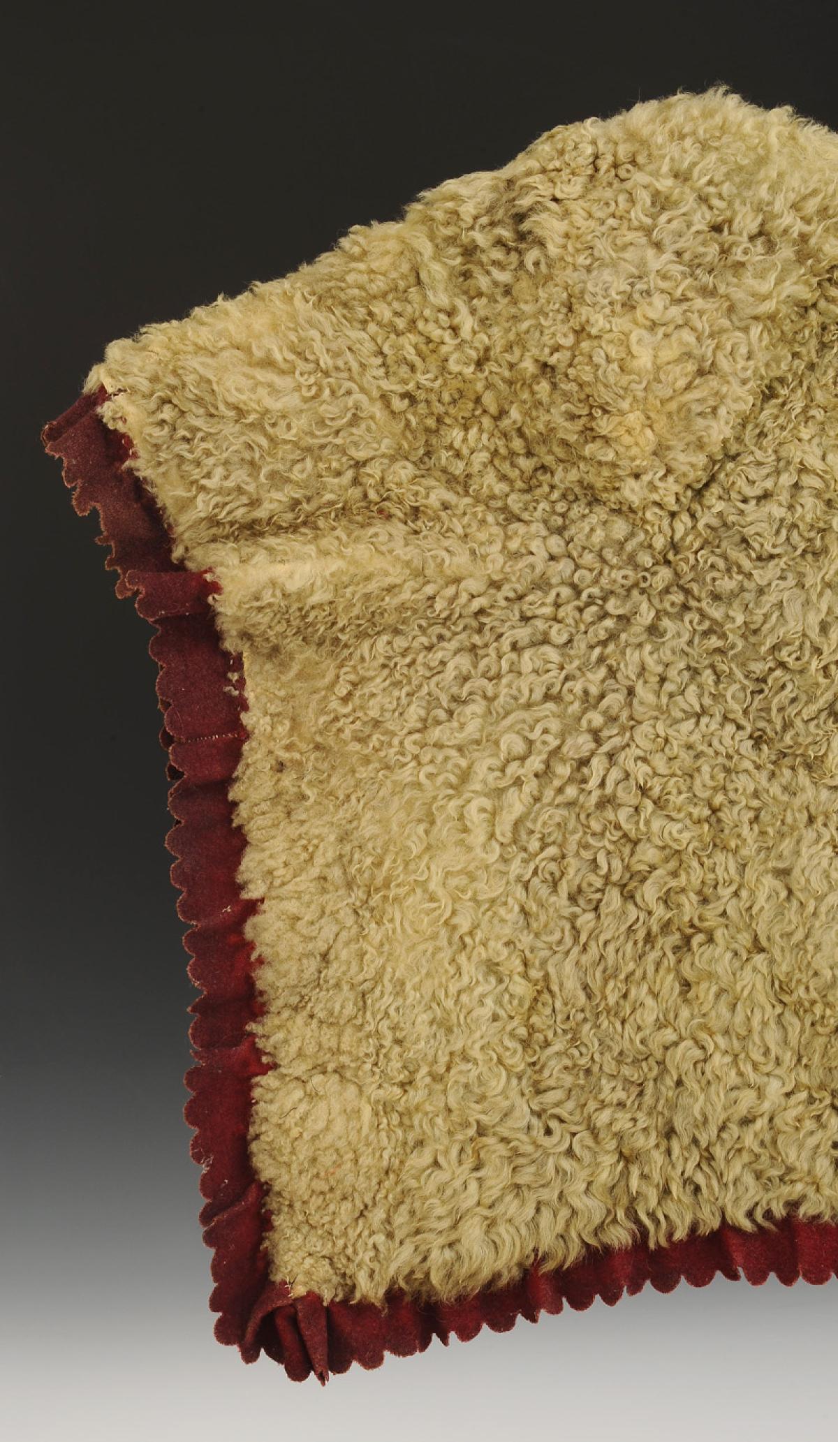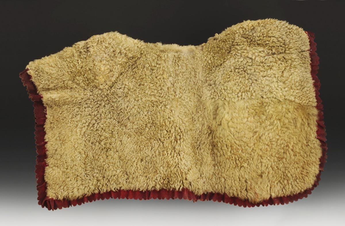 Schabraque en peau de mouton blanc doublée en forte toile écrue à chevrons, garnie sur tout son pourtour d’un galon en drap cramoisi festonné (largeur 4 cm) sur sa partie extérieure.