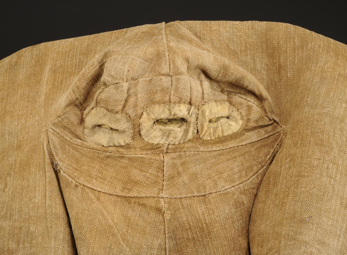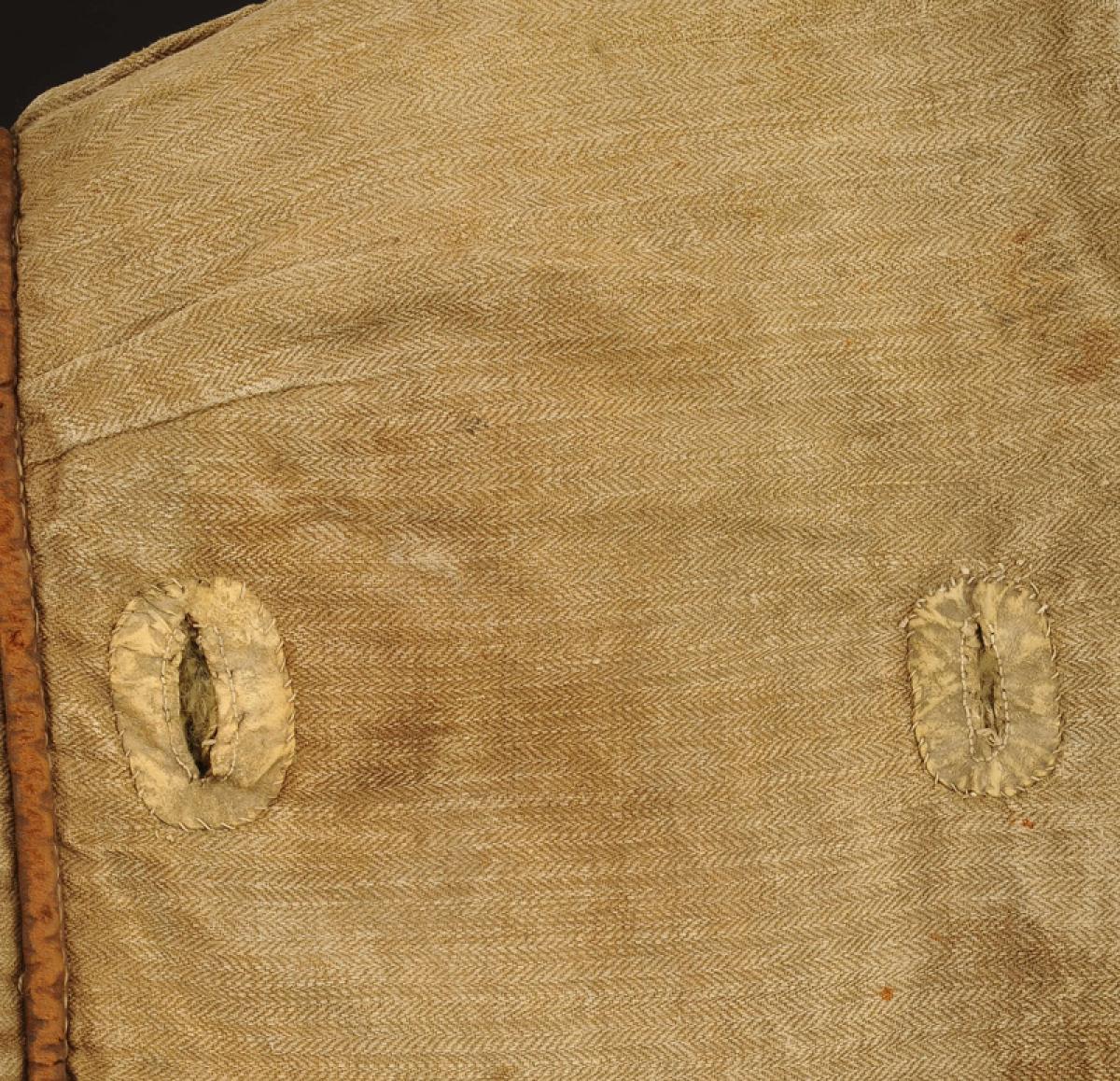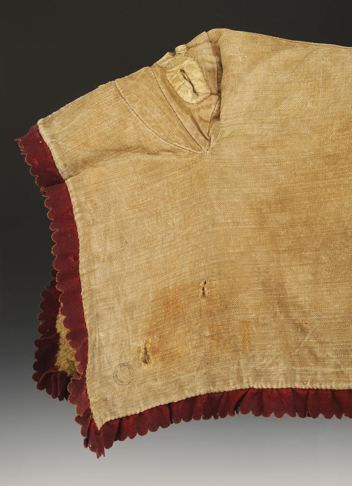Schabraque en peau de mouton blanc doublée en forte toile écrue à chevrons, garnie sur tout son pourtour d’un galon en drap cramoisi festonné (largeur 4 cm) sur sa partie extérieure.