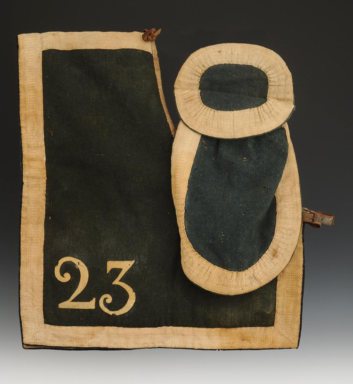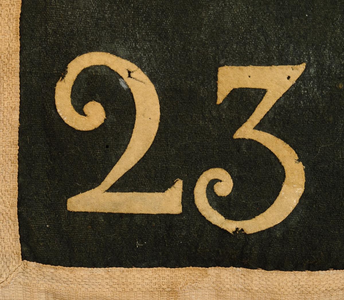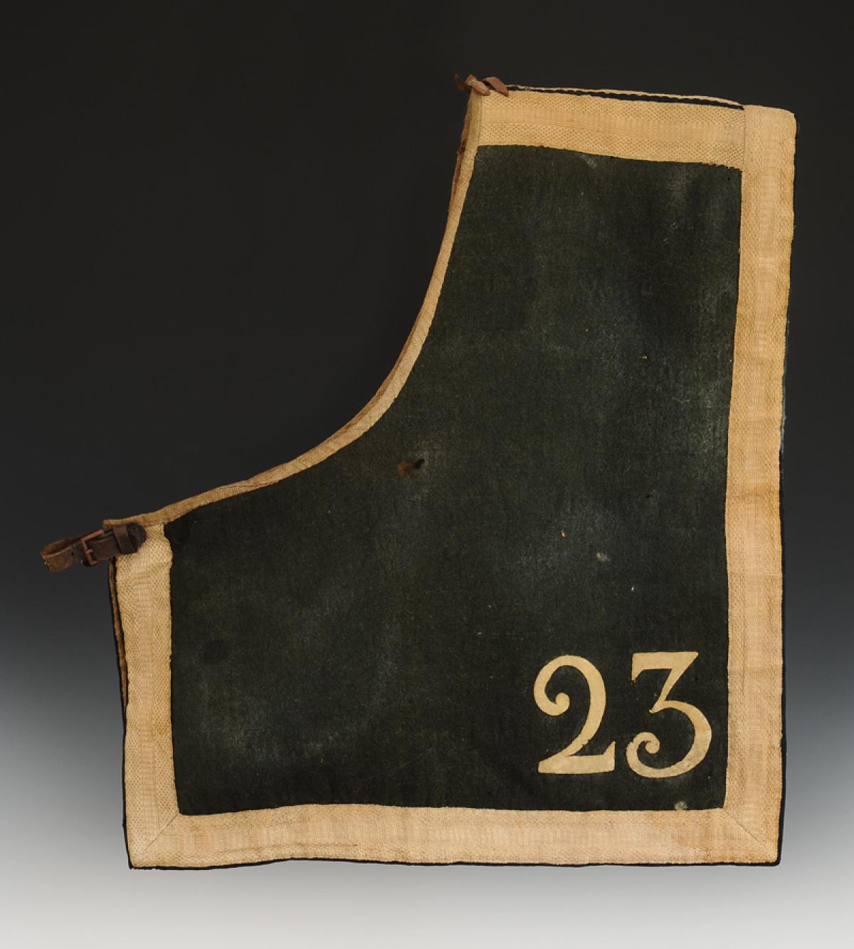 HOUSSE-CROUPELIN en drap vert bordé d'un galon tissé de fils blancs (largeur 4 cm), bords inférieurs en pointes. Numéro « 23 » découpé en drap blanc, H du chiffre 2 : 9 cm, largeur du chiffre 2 : 7 cm, H du chiffre 3 : 9 cm, largeur du chiffre 3 : 6 cm.